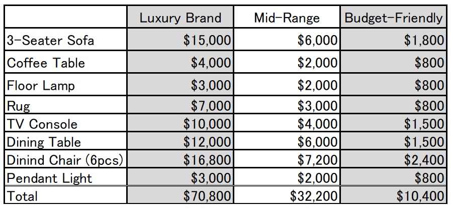 We’ve covered the 3-seater fabric sofa prices for three tiers: high-end, mid-range, and budget. So how much would it cost to furnish an entire living & dining room set in each tier?