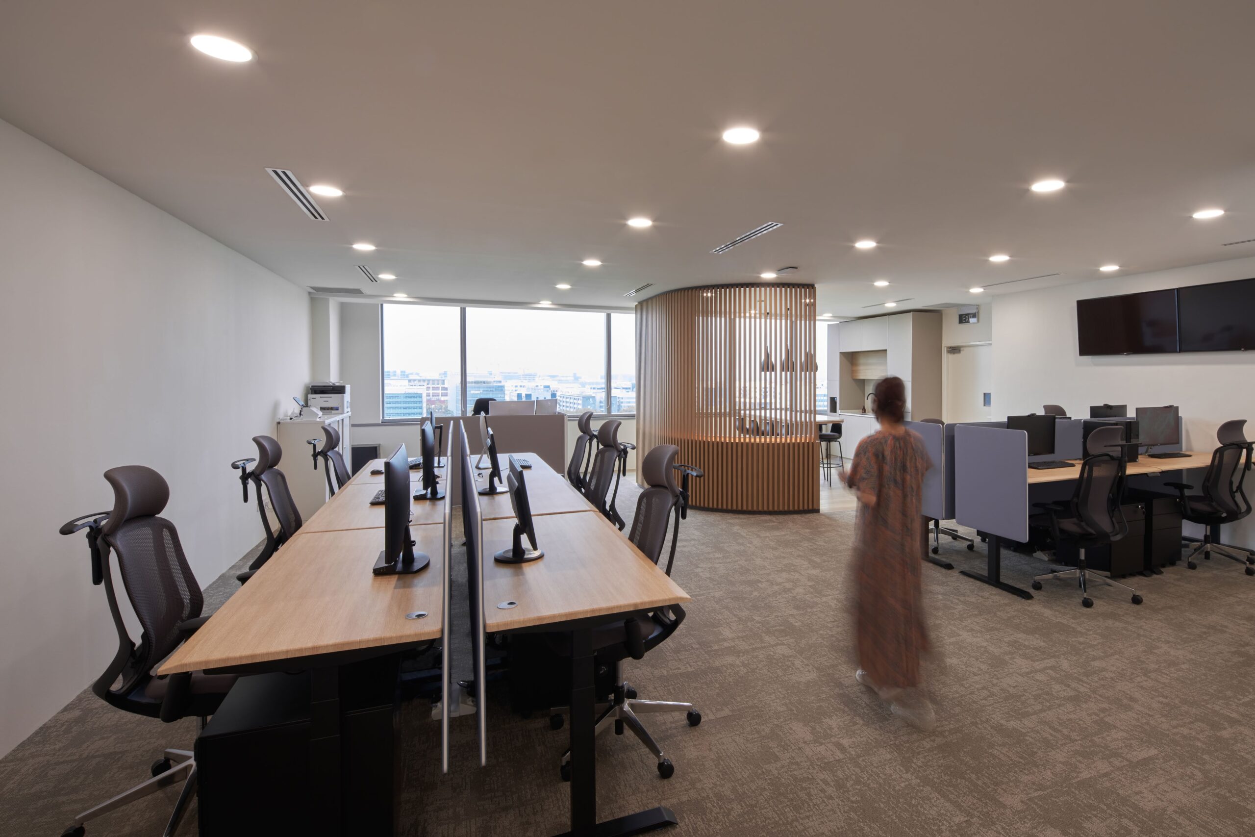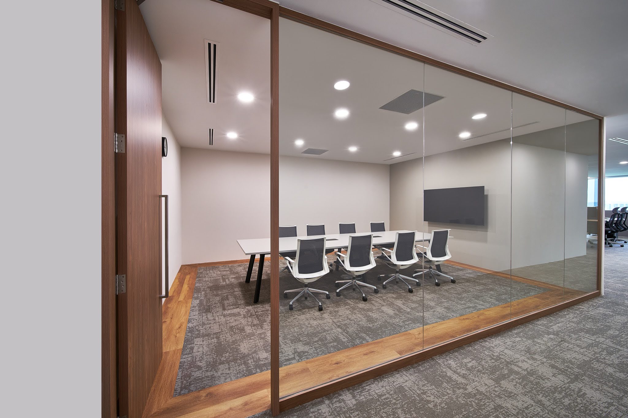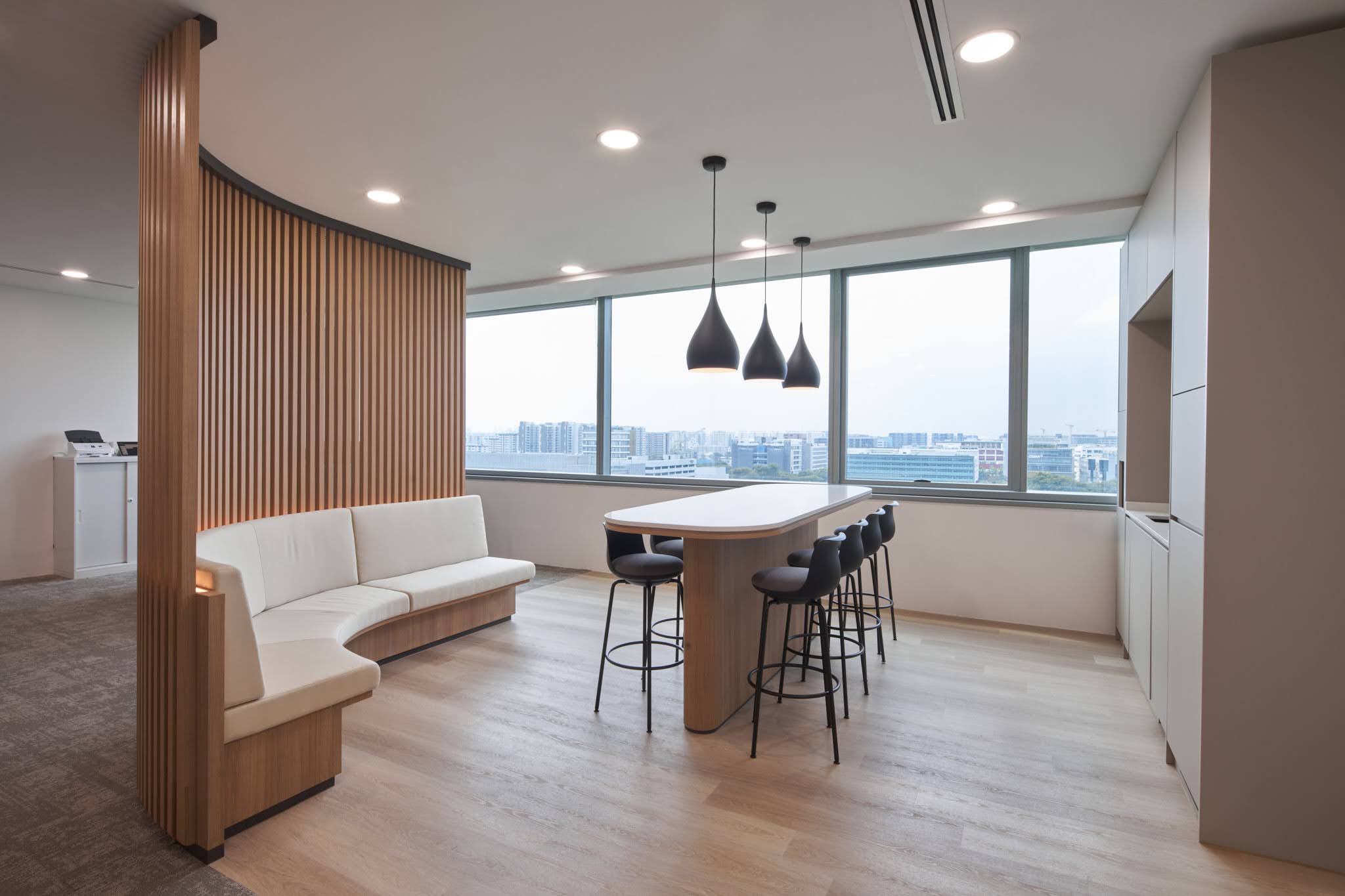 Just steps from the desks, we created a bright pantry that doubles as a relaxed breakout space — perfect for casual meetings or coffee breaks. Details like wooden-framed glass partitions add warmth and style, giving the office a simple yet polished character. The result is an environment where ideas flow freely, and people genuinely enjoy spending their workday.