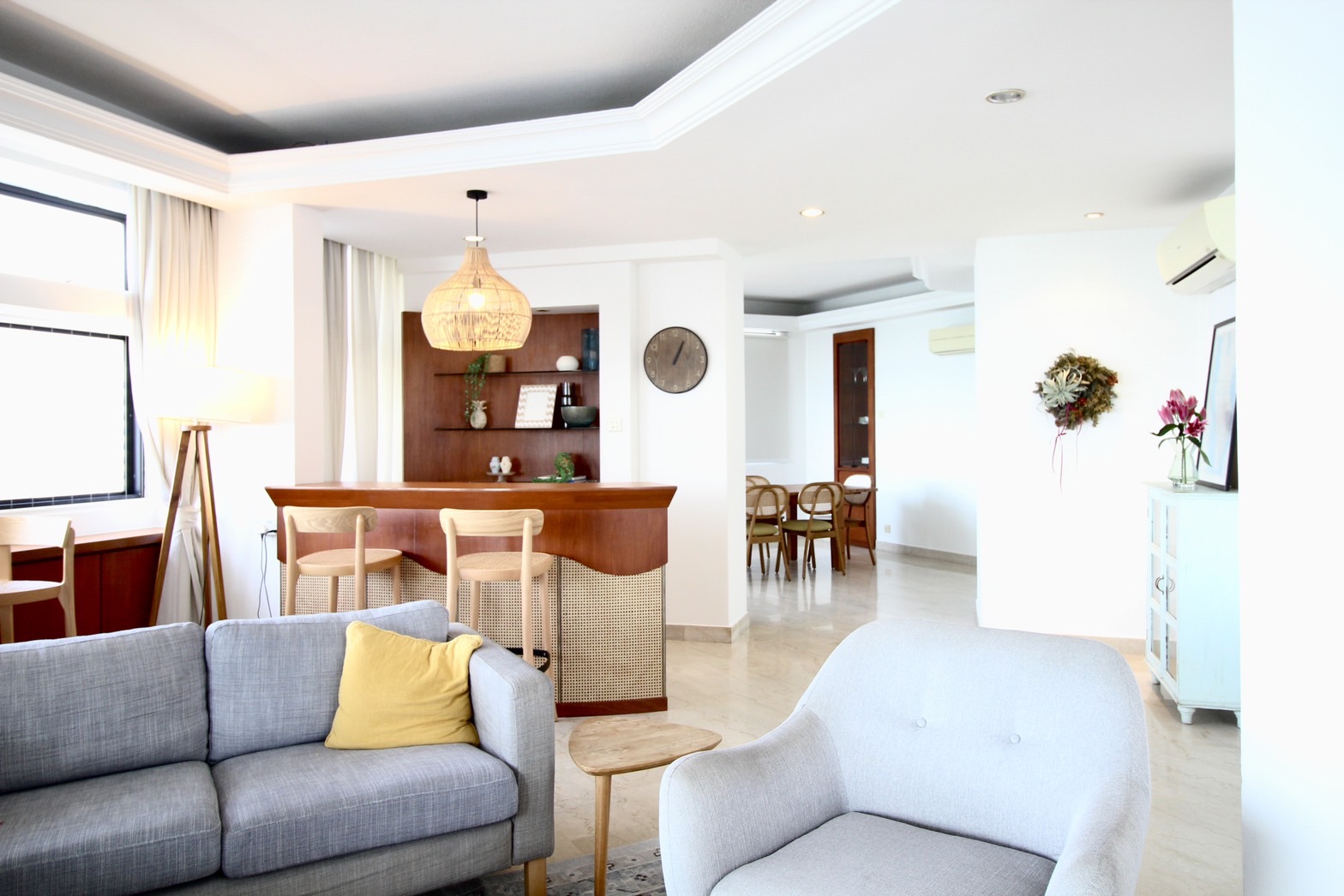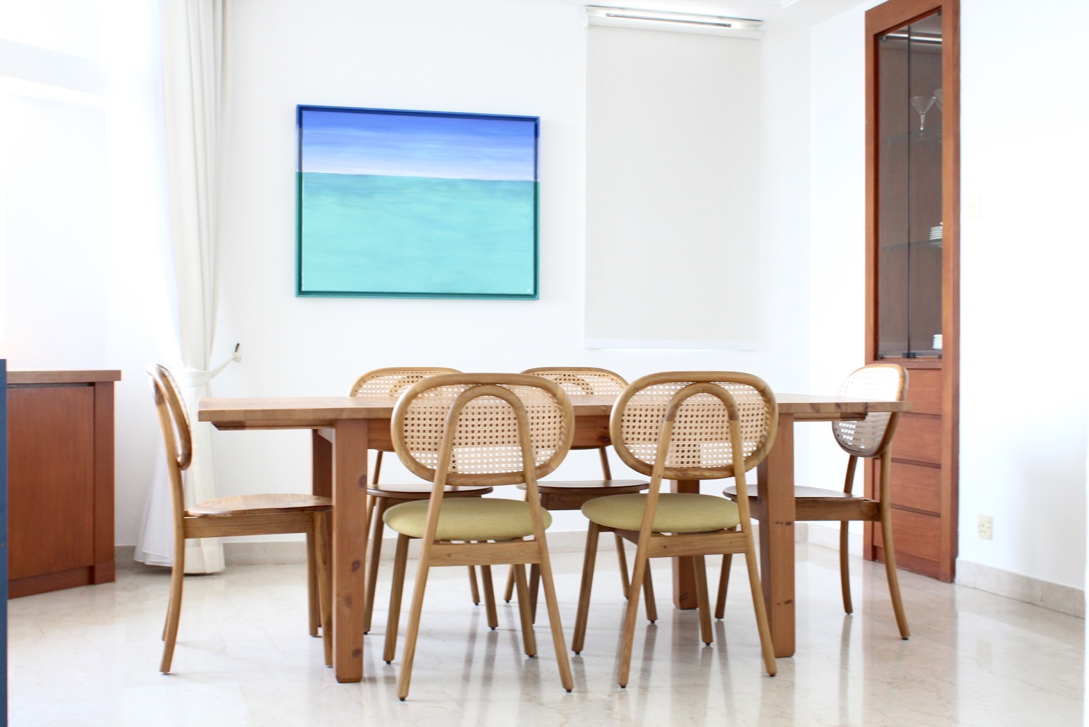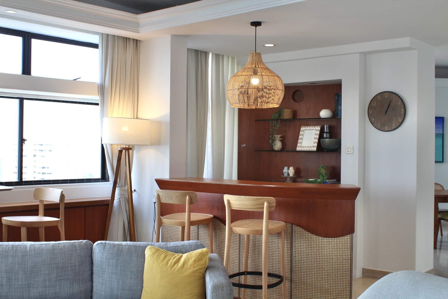 Imagine waking up to the sound of waves and the endless blue of the ocean—that’s the everyday reality in this seaside condominium. The client kept their beloved sofa and dining table but refreshed the look with new rugs, lighting, a bar table with stools, dining chairs, and accessories. Inspired by the sea and sky, we brought in soft blues and natural rattan textures, including removable rattan-patterned wallpaper that instantly lightened the existing wood furniture. The result is a relaxed, tropical retreat with the warmth of Bali and the closeness of the sea and sky. As it is so inviting, it even caught the attention of the “Ohayo-ko Channel” on YouTube!