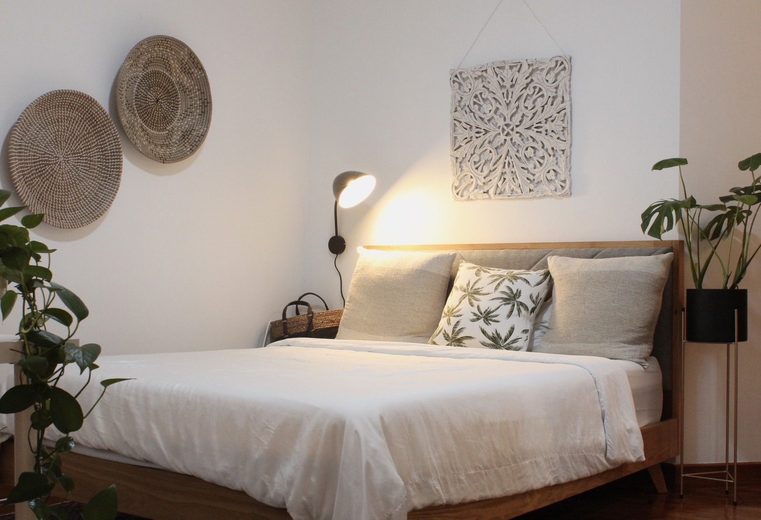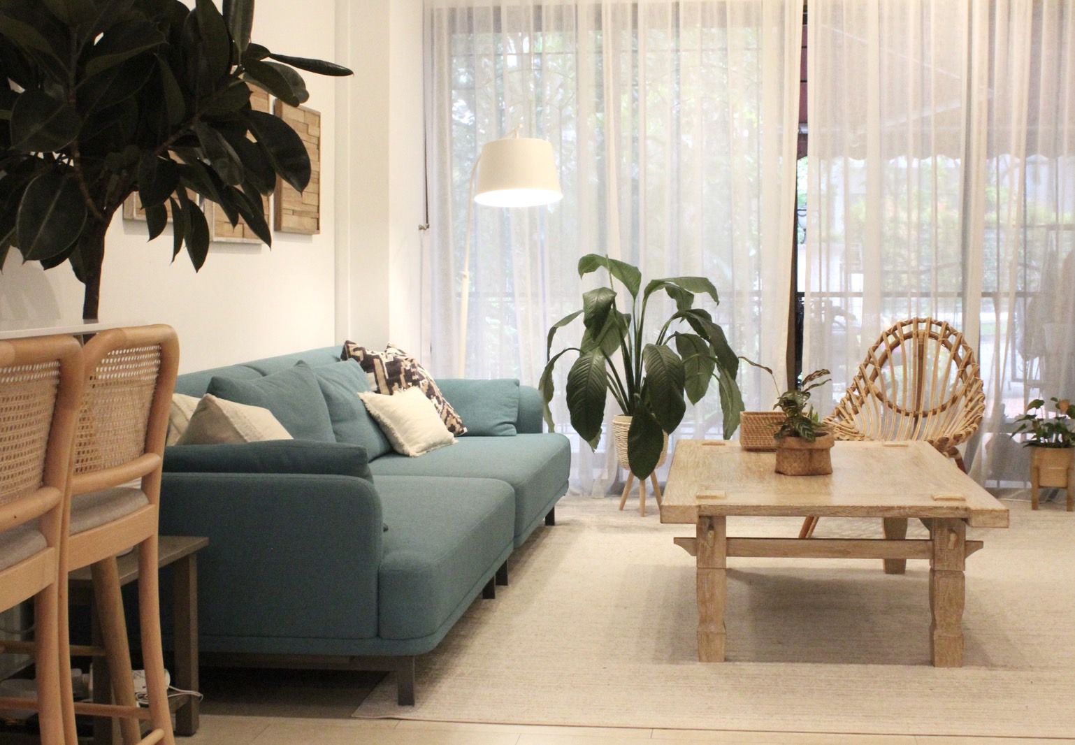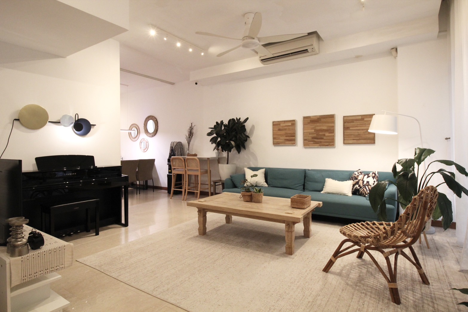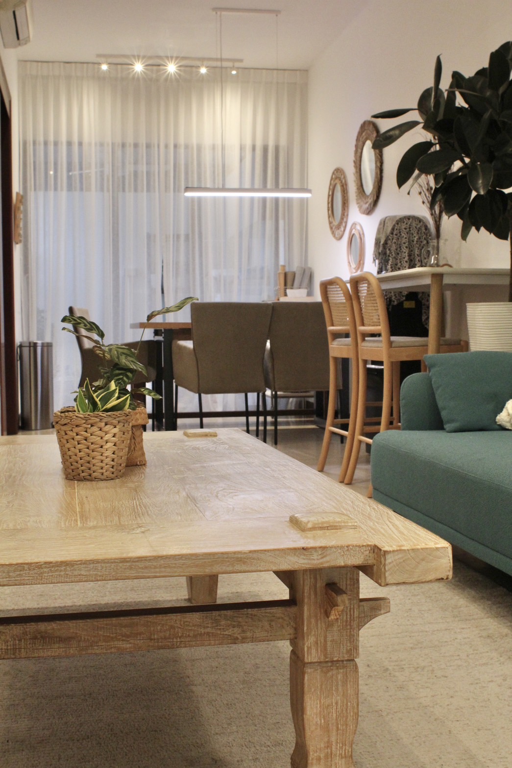 By replacing heavy curtains placed by a property owner, with light, airy treatments and introducing a vibrant turquoise sofa, we set the stage for a cheerful bohemian style that the client adores. The mix of a sleek, modern sofa with rustic tables and rattan textures creates a relaxed, eclectic vibe. A counter table offers a cozy homework spot for the children, while a quirky “please wait to be seated” light above the piano adds a dash of personality. In the bedroom and study, art walls double as stylish backdrops for video calls, making these spaces both functional and visually inspiring.