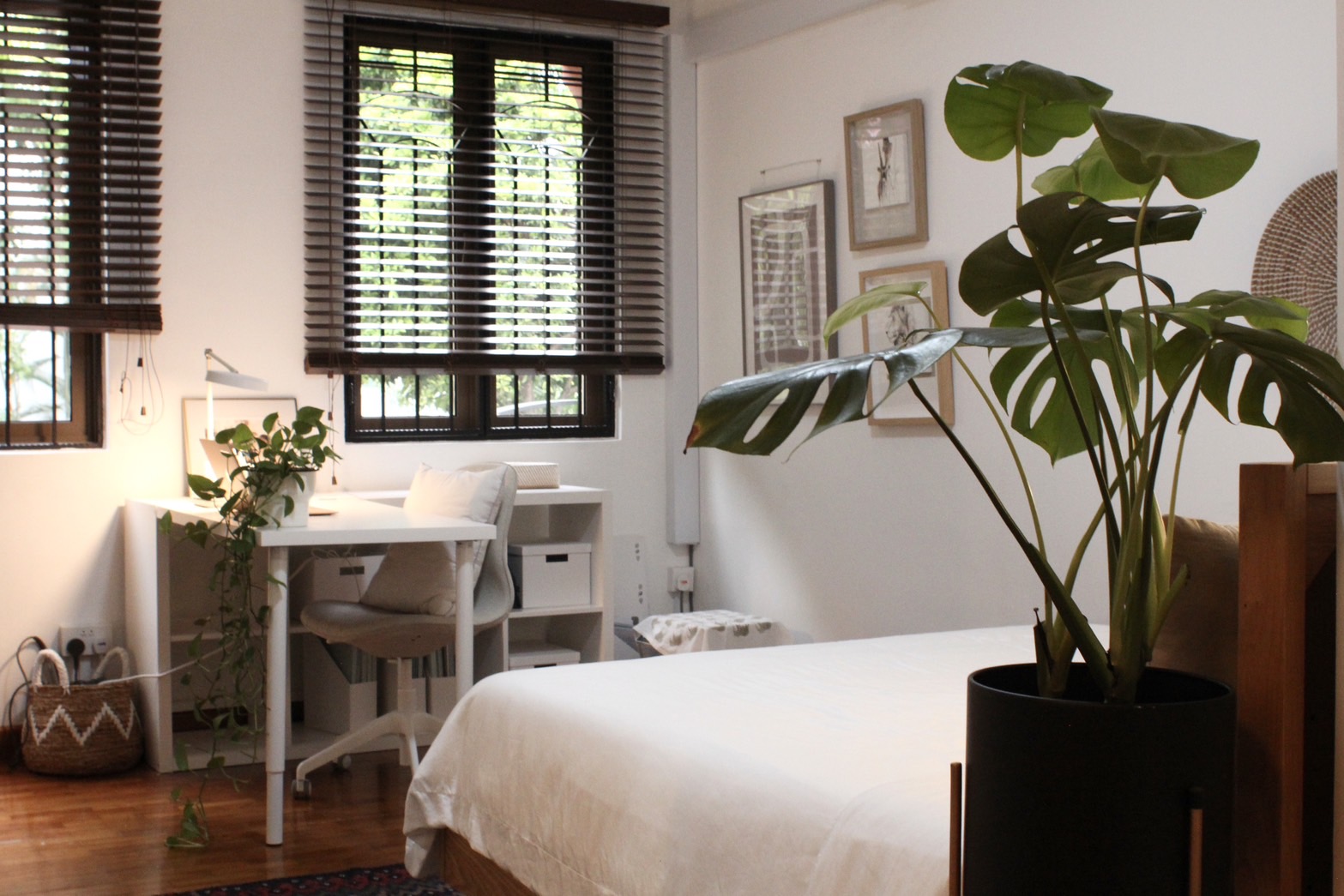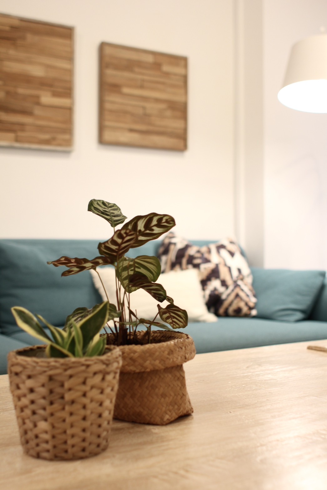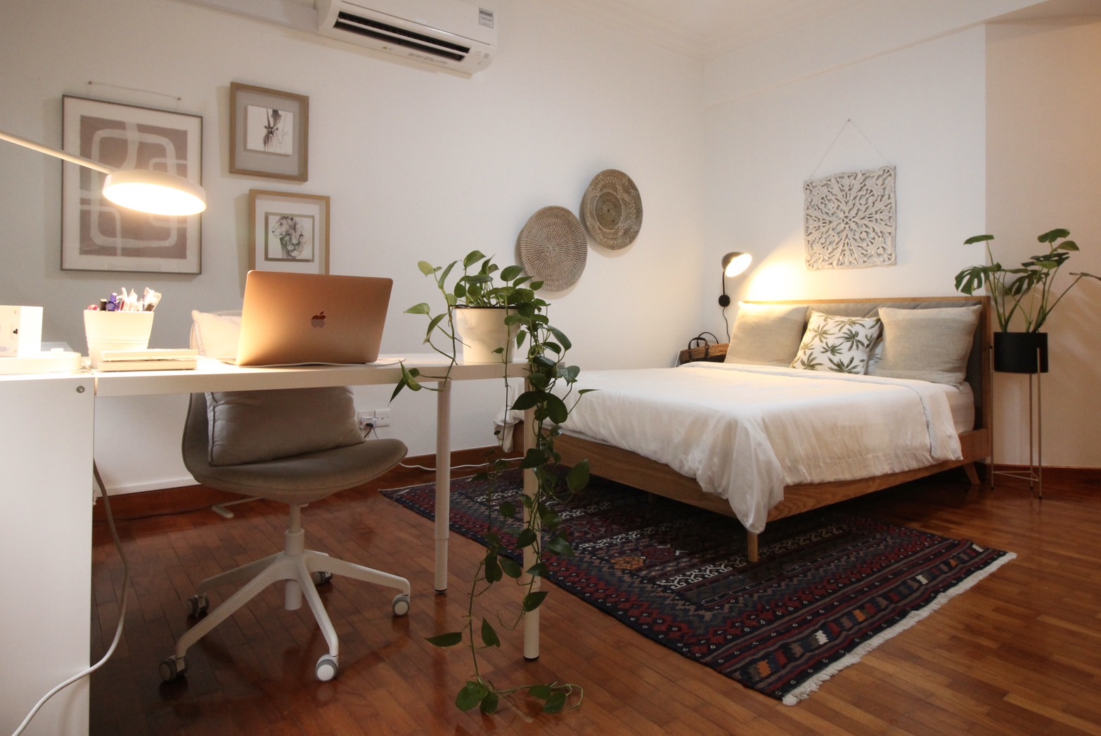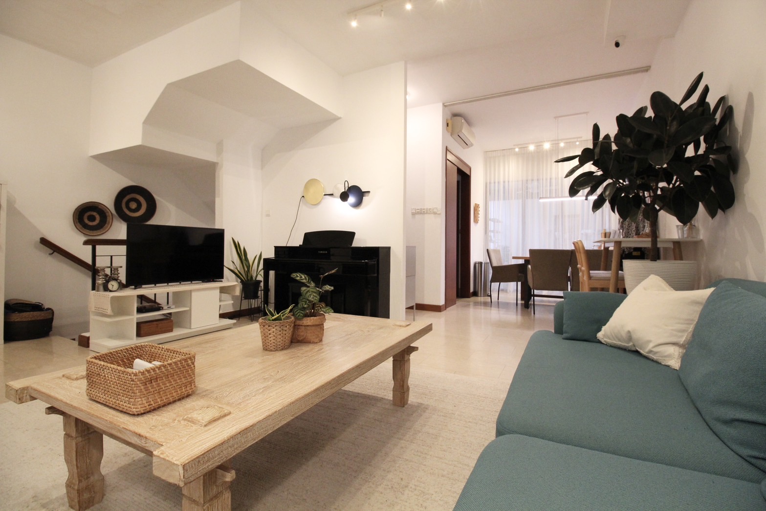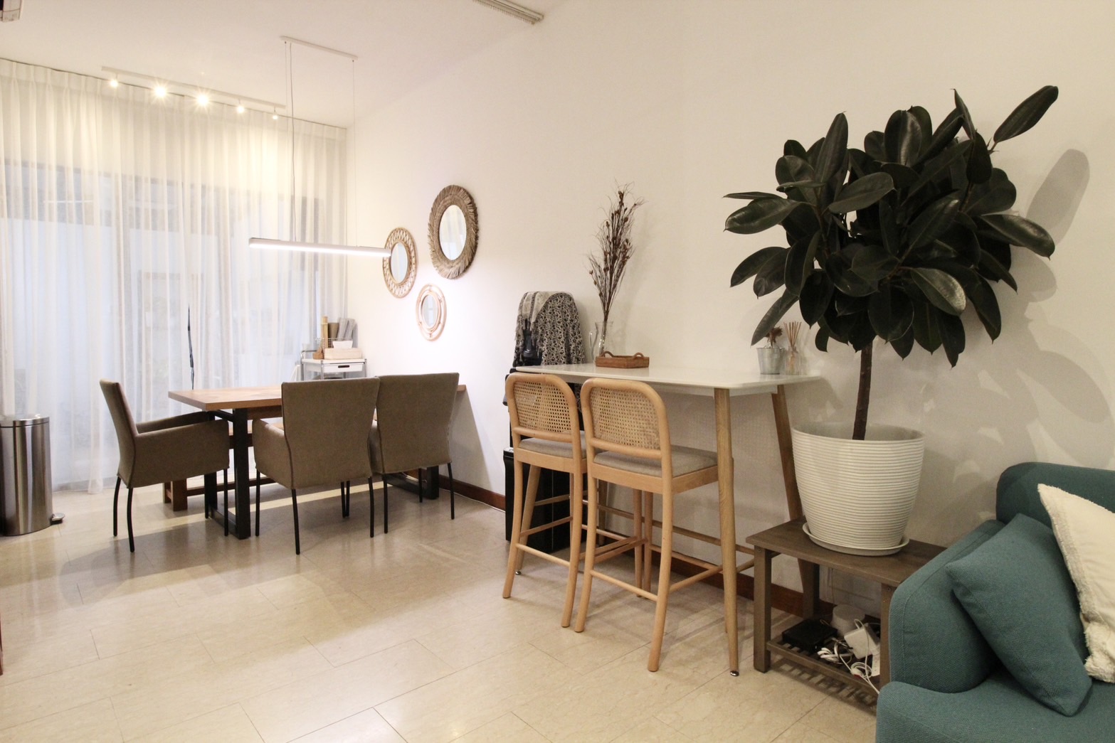 By replacing heavy curtains placed by a property owner, with light, airy treatments and introducing a vibrant turquoise sofa, we set the stage for a cheerful bohemian style that the client adores. The mix of a sleek, modern sofa with rustic tables and rattan textures creates a relaxed, eclectic vibe. A counter table offers a cozy homework spot for the children, while a quirky “please wait to be seated” light above the piano adds a dash of personality. In the bedroom and study, art walls double as stylish backdrops for video calls, making these spaces both functional and visually inspiring.