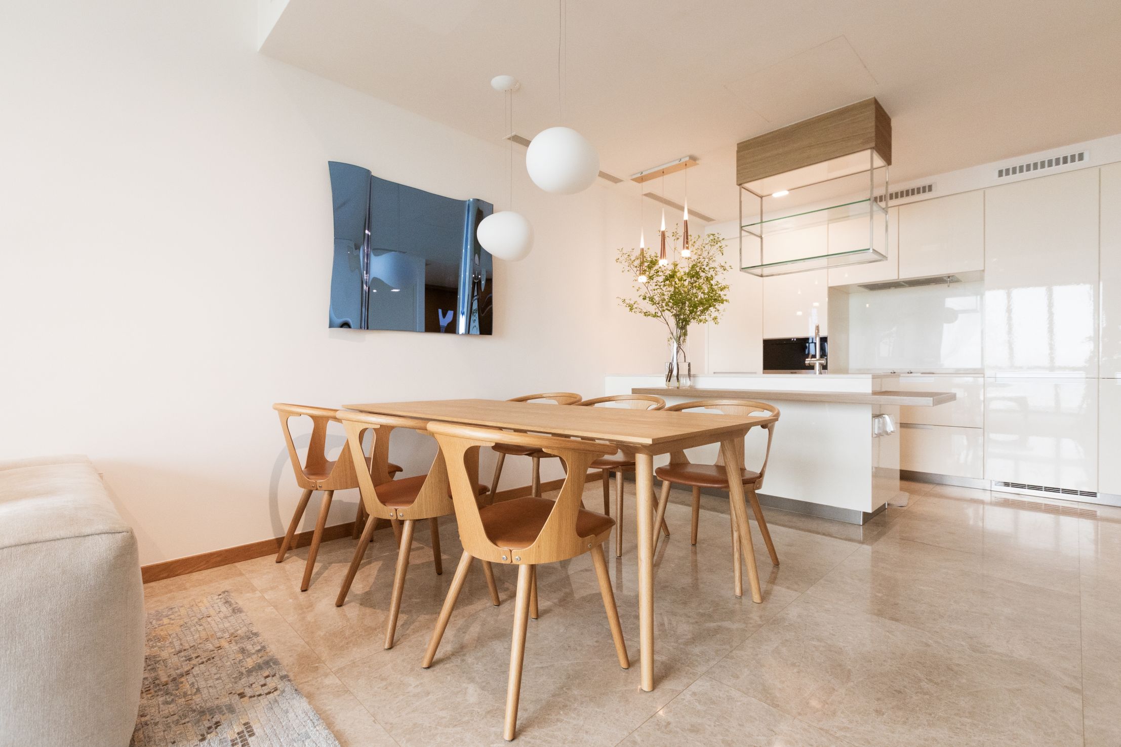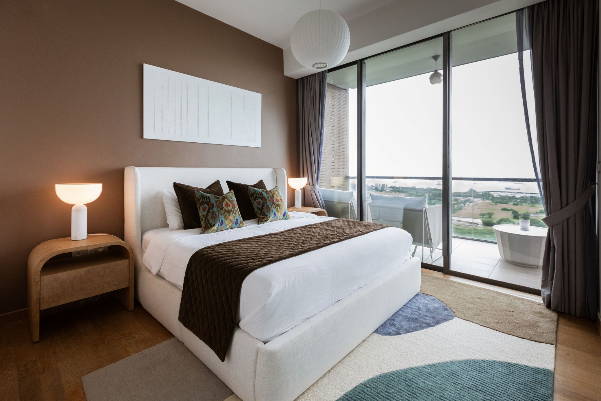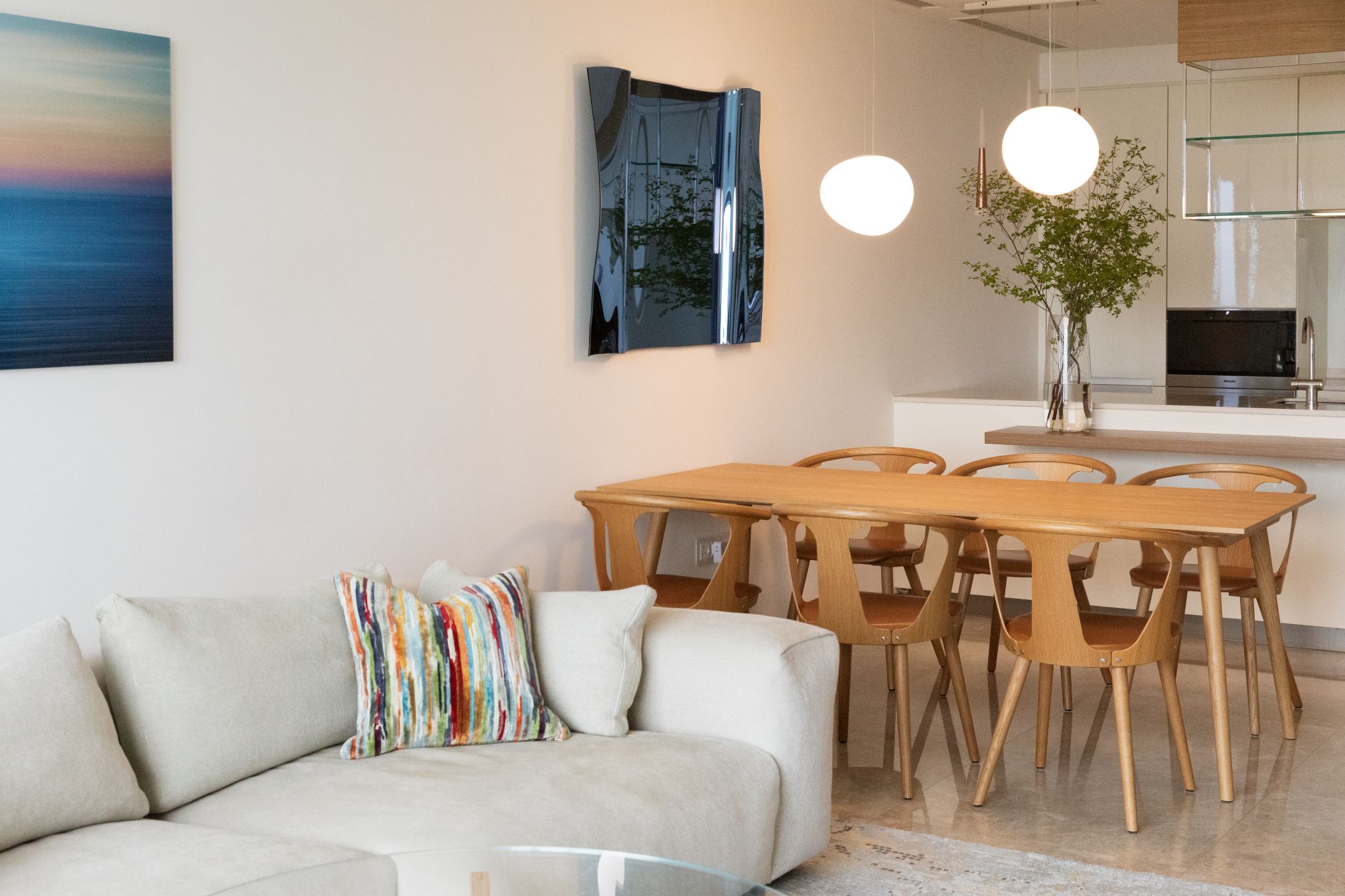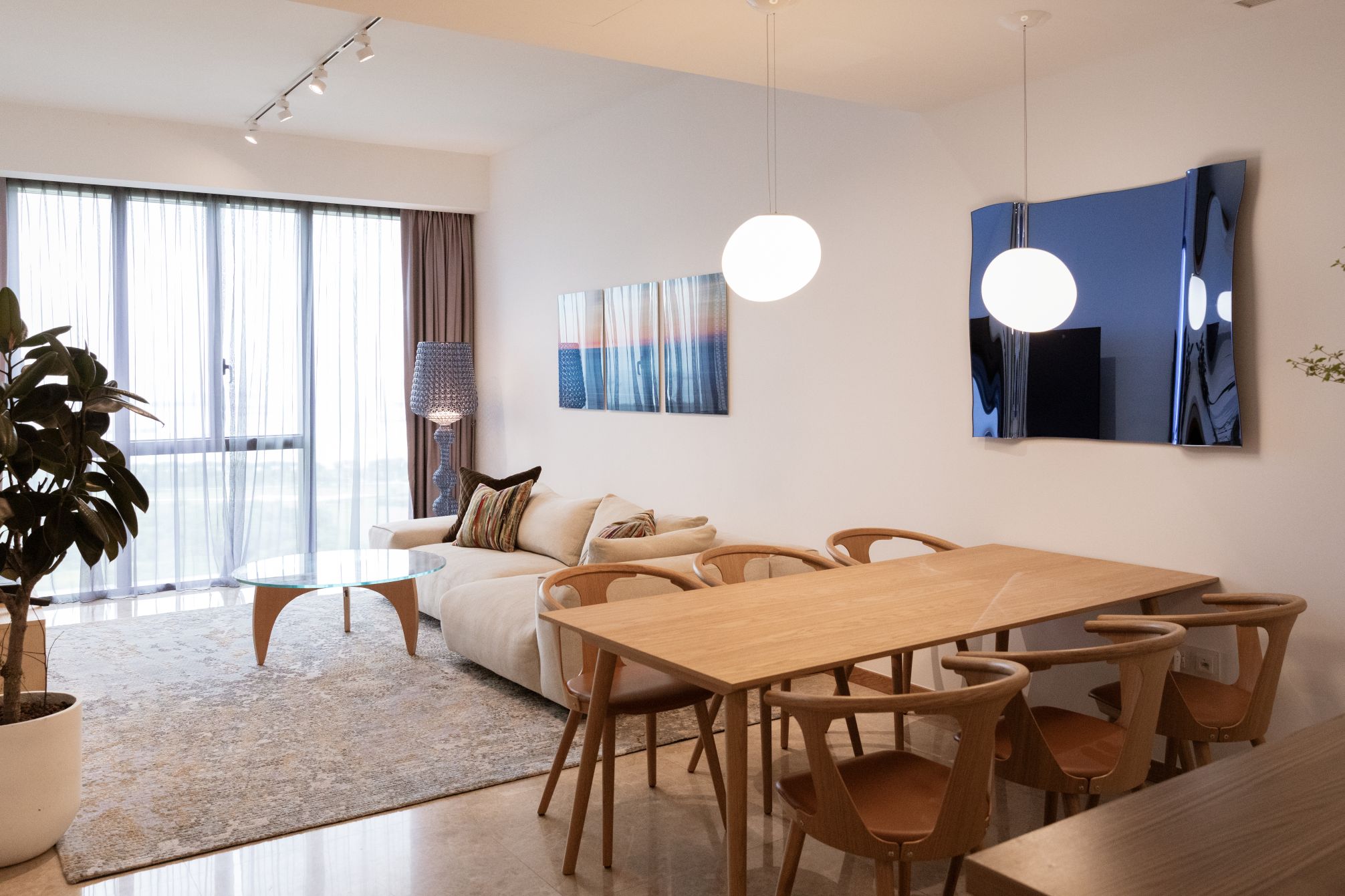 Set against the backdrop of the Singapore sea, this home bursts with personality — a perfect balance of vibrant color, light, and timeless design. The client wanted an interior that was playful yet cohesive, lively yet refined. The design began with classic Scandinavian furniture, known for its clean lines and enduring style. To reflect the client’s individuality, we layered in art, accessories, and unexpected accents. The piece that set the tone was a bold blue Glas Italia mirror placed at the far end of the dining area — a contemporary Italian statement that added sophistication and edge to the Scandinavian foundation. Along the wall, photographic art leads the eye toward the sculptural Kartell Kabuki floor lamp, which adds drama and personality. A curated mix of rugs, cushions, and warmer lighting softened the overall atmosphere, making the space inviting and comfortable. One of the client’s favorite additions is a colorful console table that now serves as a joyful welcome for guests. The same approach was carried into the bedrooms. In the master bedroom, dark brown walls provide a rich contrast to the bright sea views and crisp white bed frame, creating a chic yet airy retreat. This is a home where every detail — from the placement of art to the glow of light — celebrates both style and individuality.