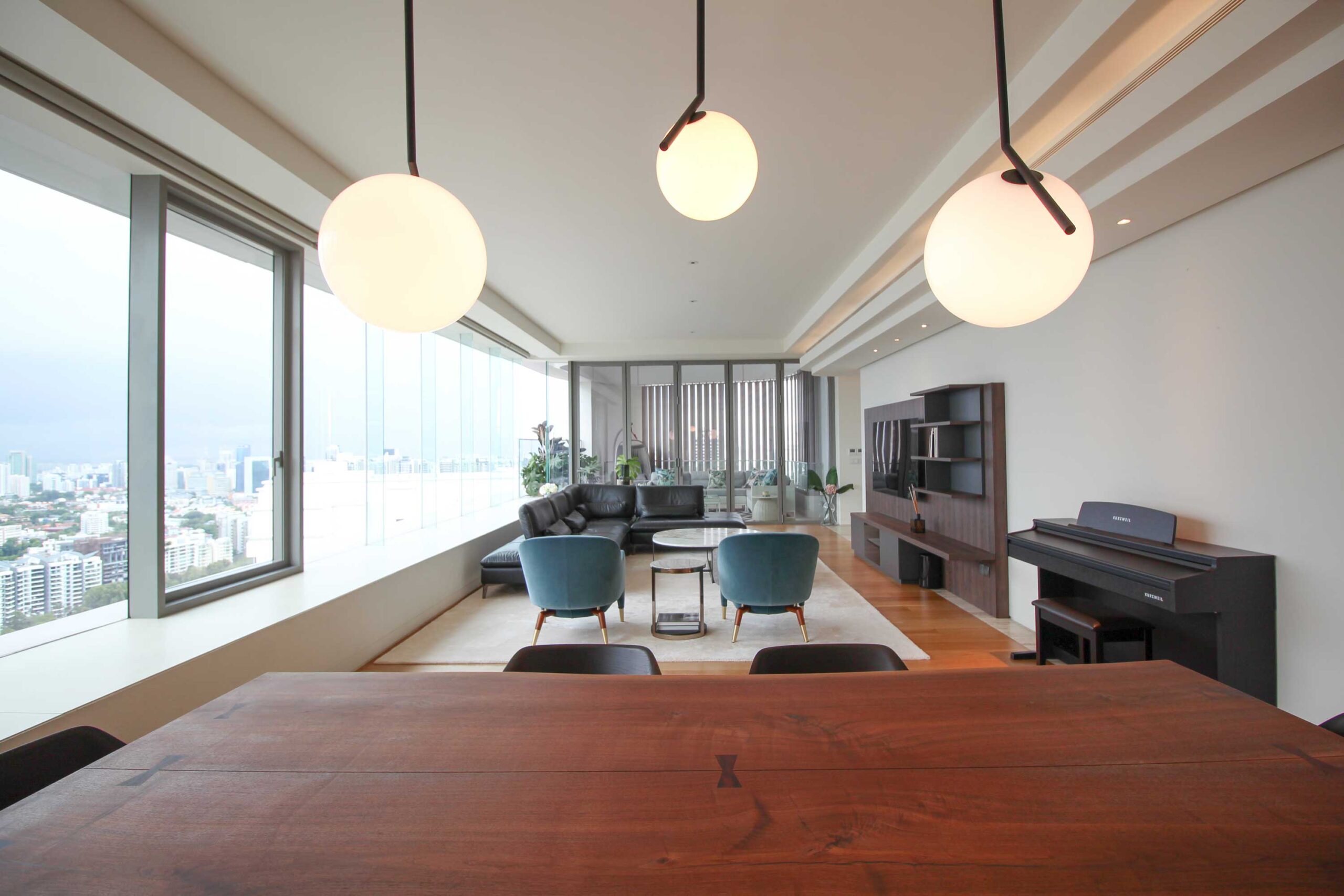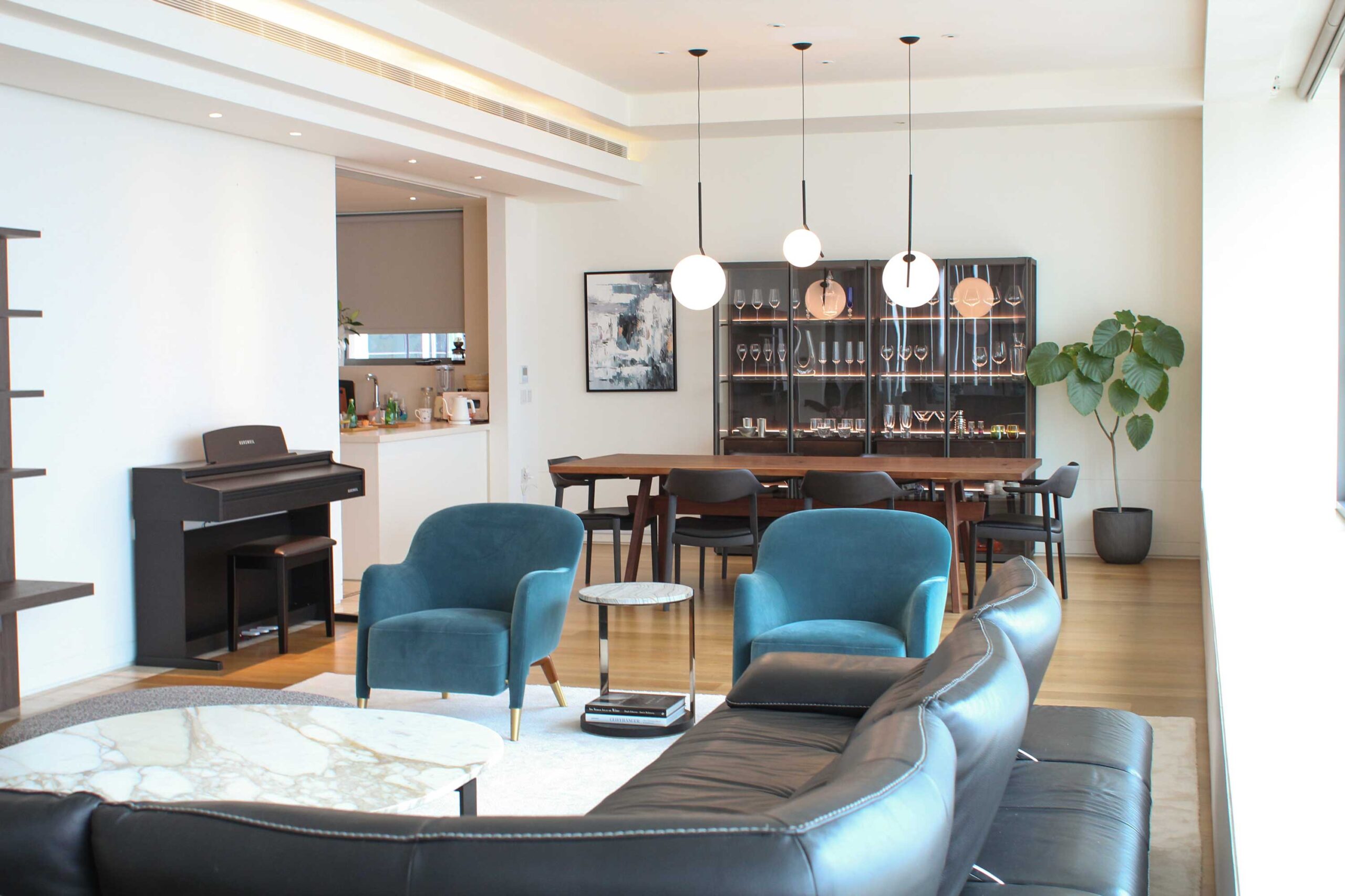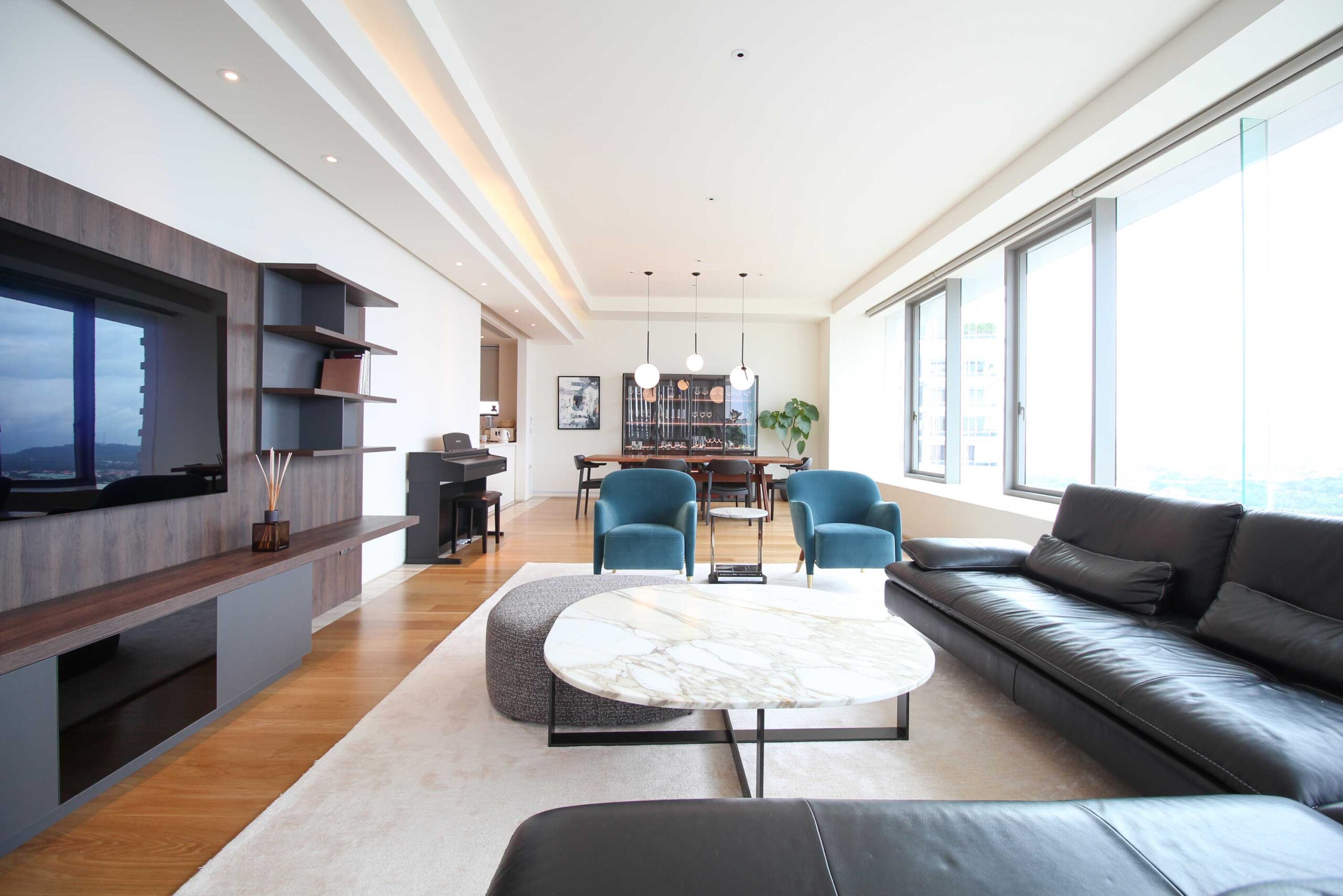 After relocating from overseas, our client brought only their favorite sofa, with everything else was designed new. In the long, narrow living-dining space, we installed a custom TV board to anchor the room.