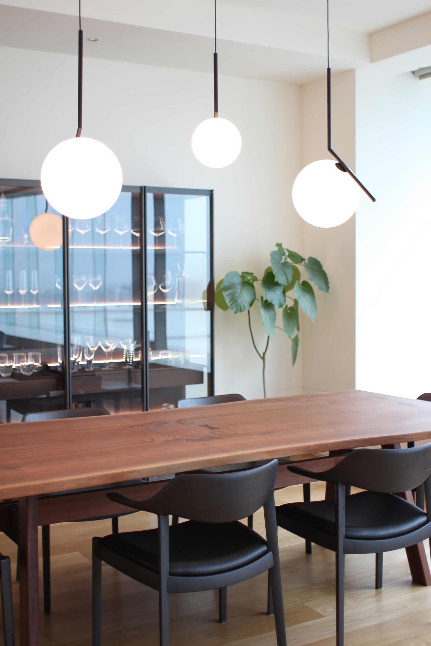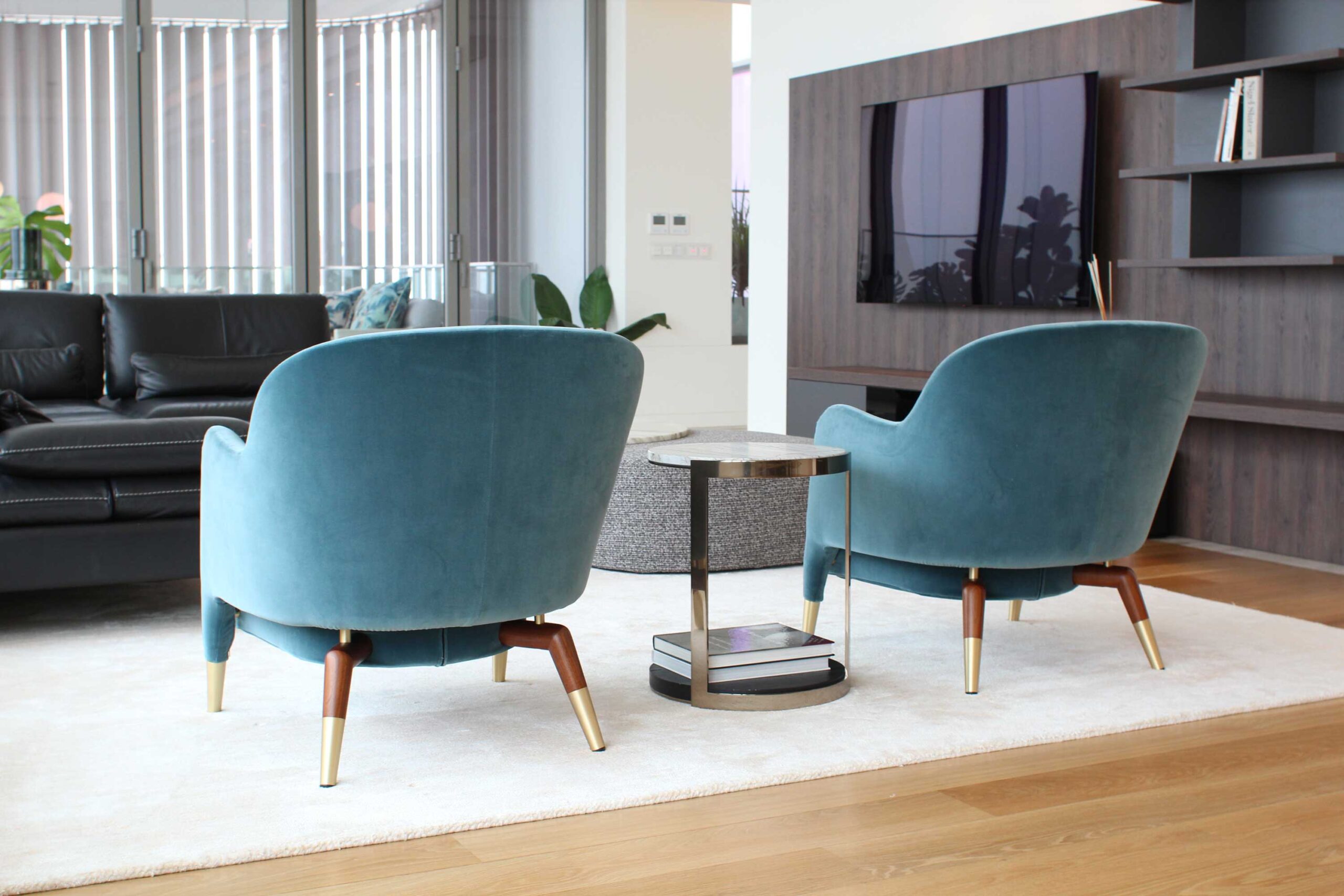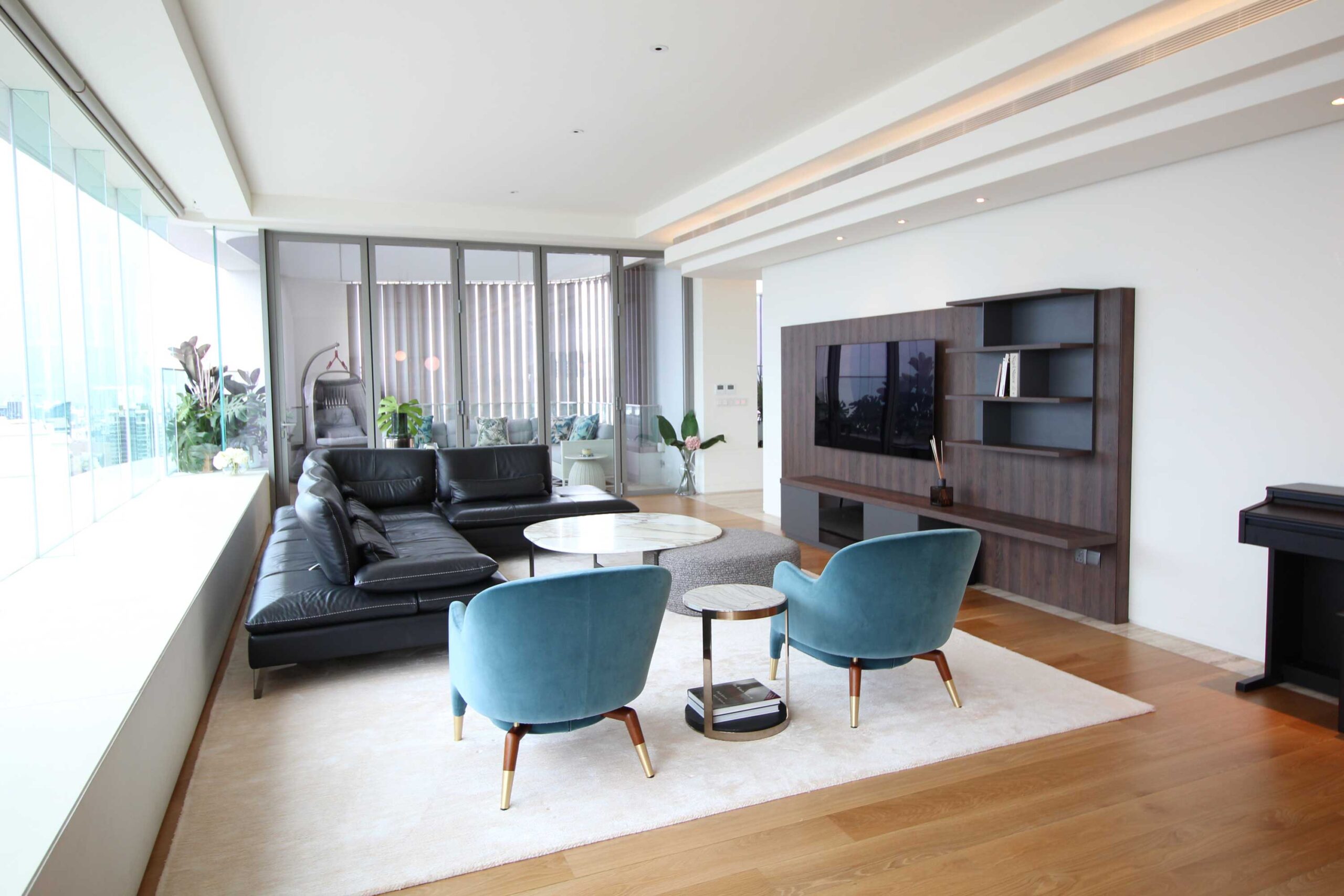 After relocating from overseas, our client brought only their favorite sofa, with everything else was designed new. In the long, narrow living-dining space, we installed a custom TV board to anchor the room.