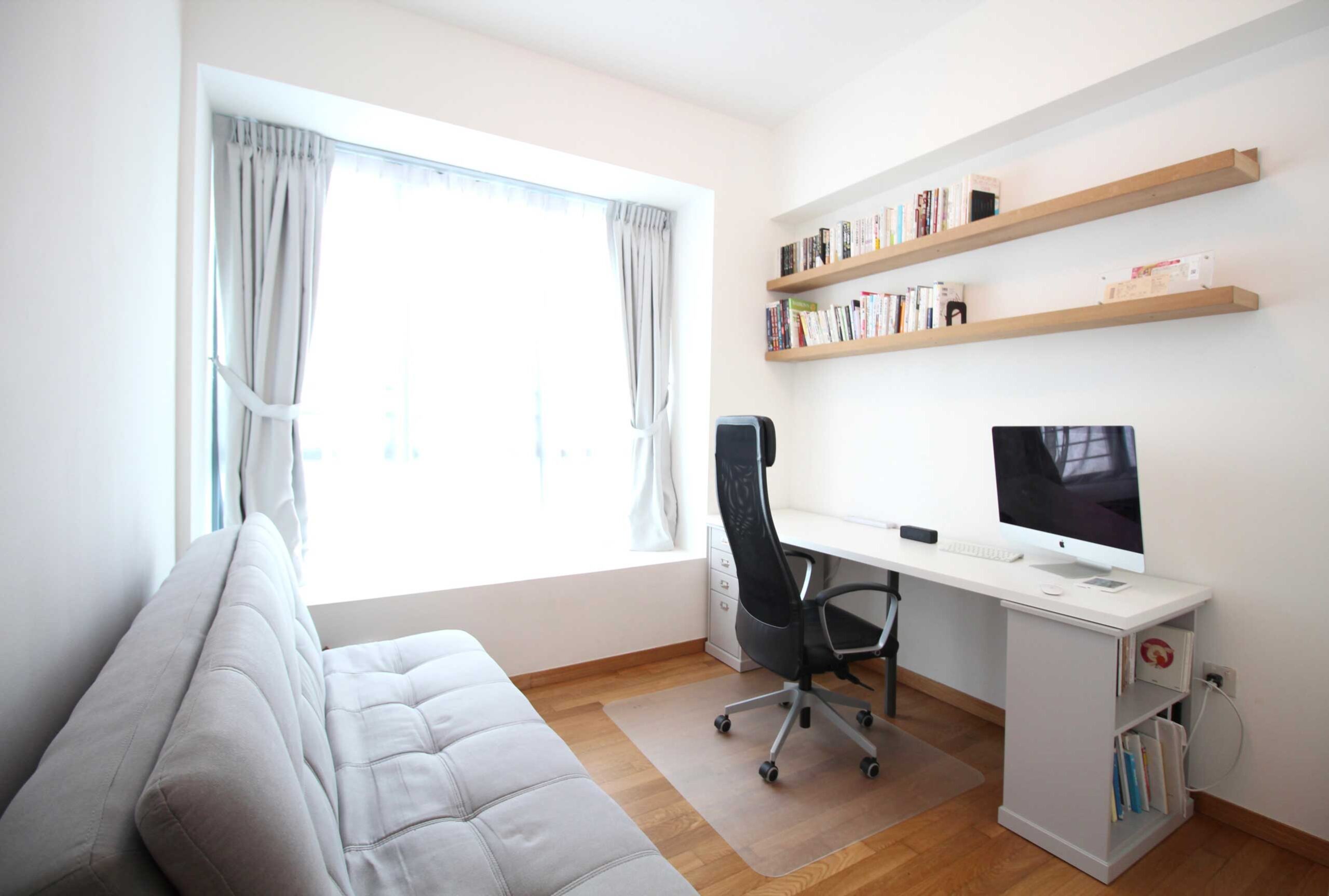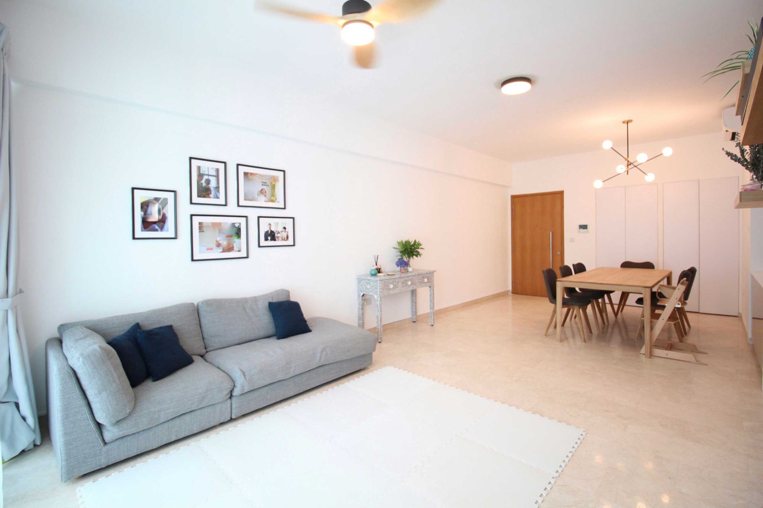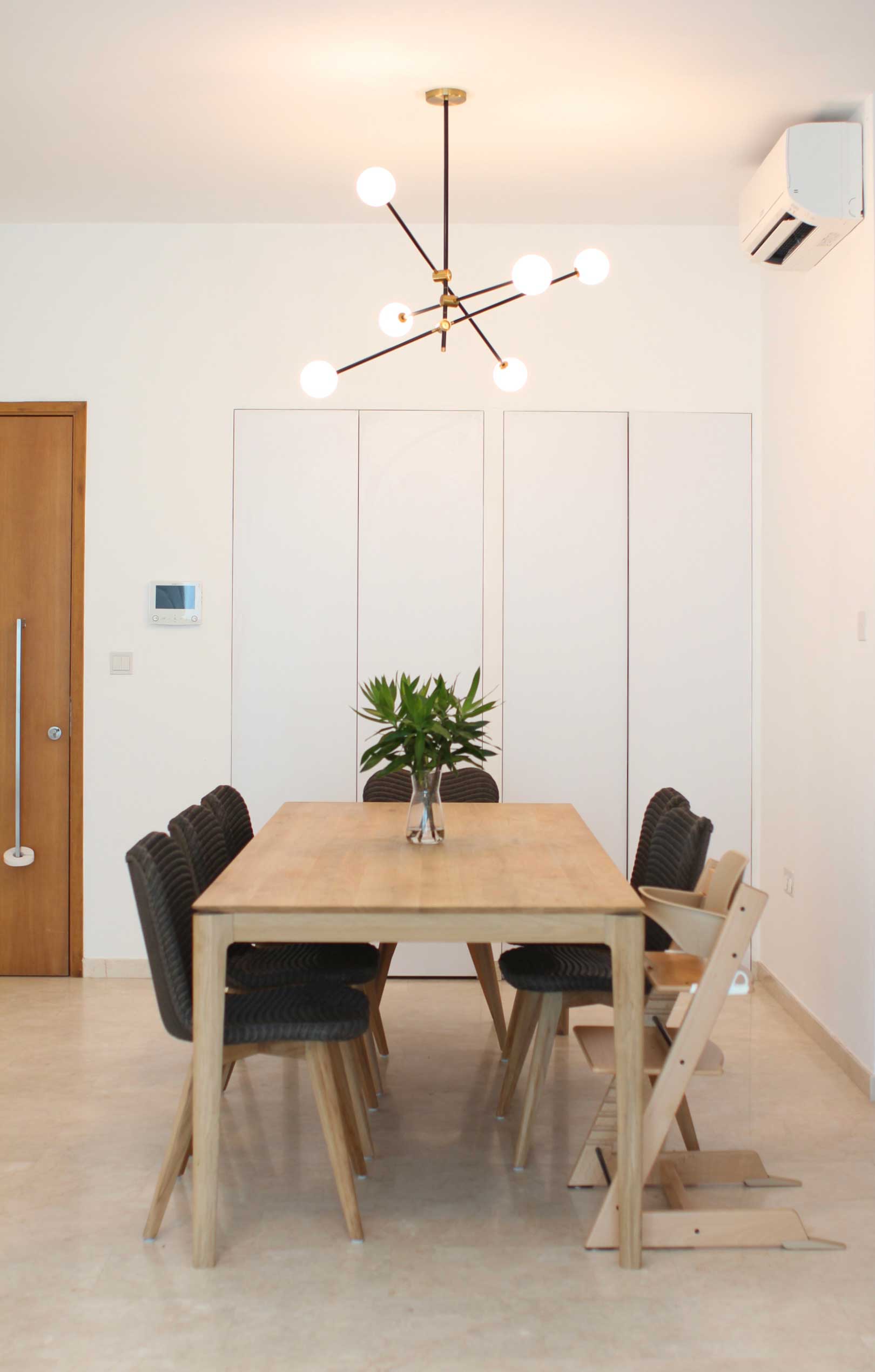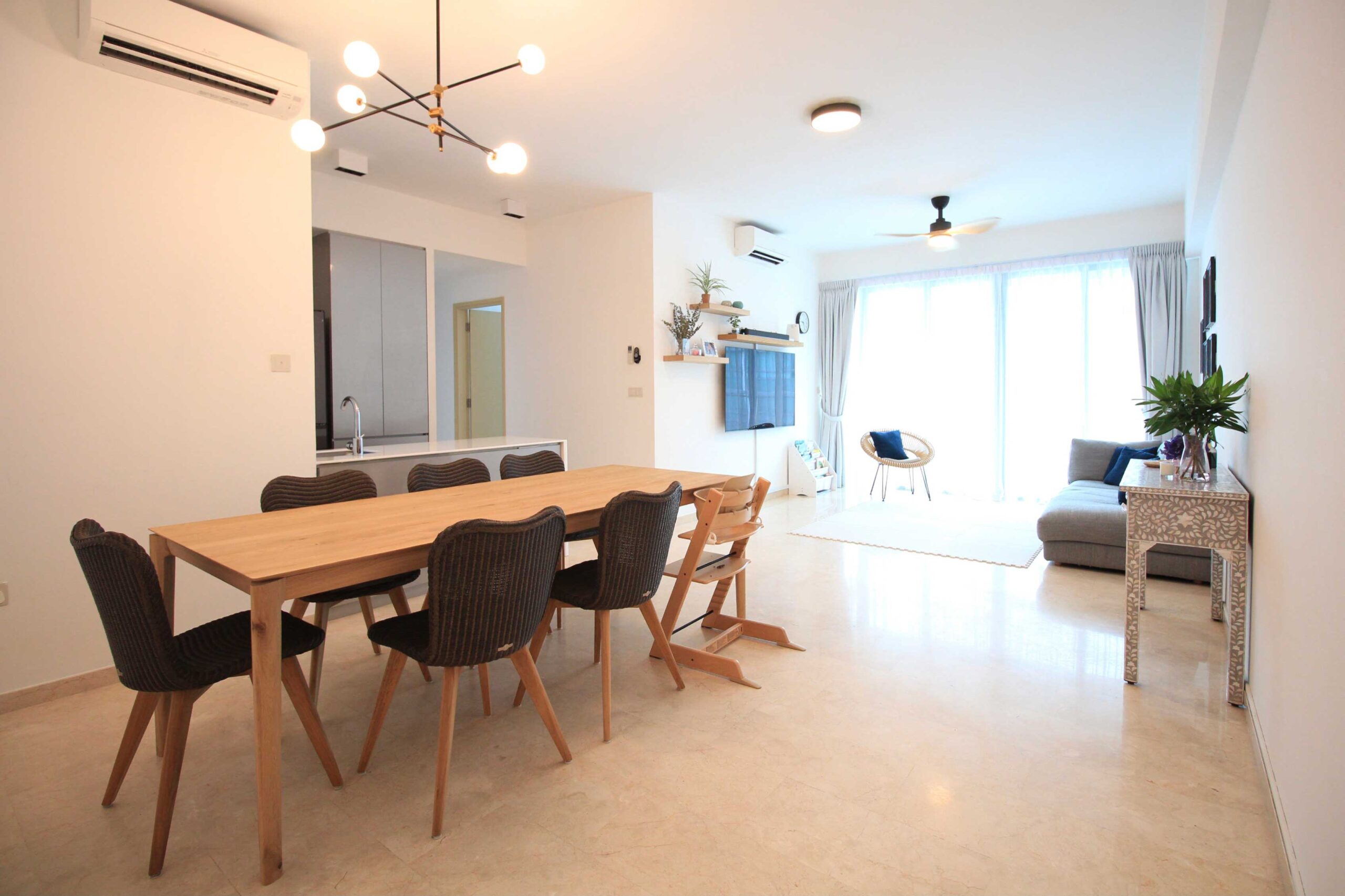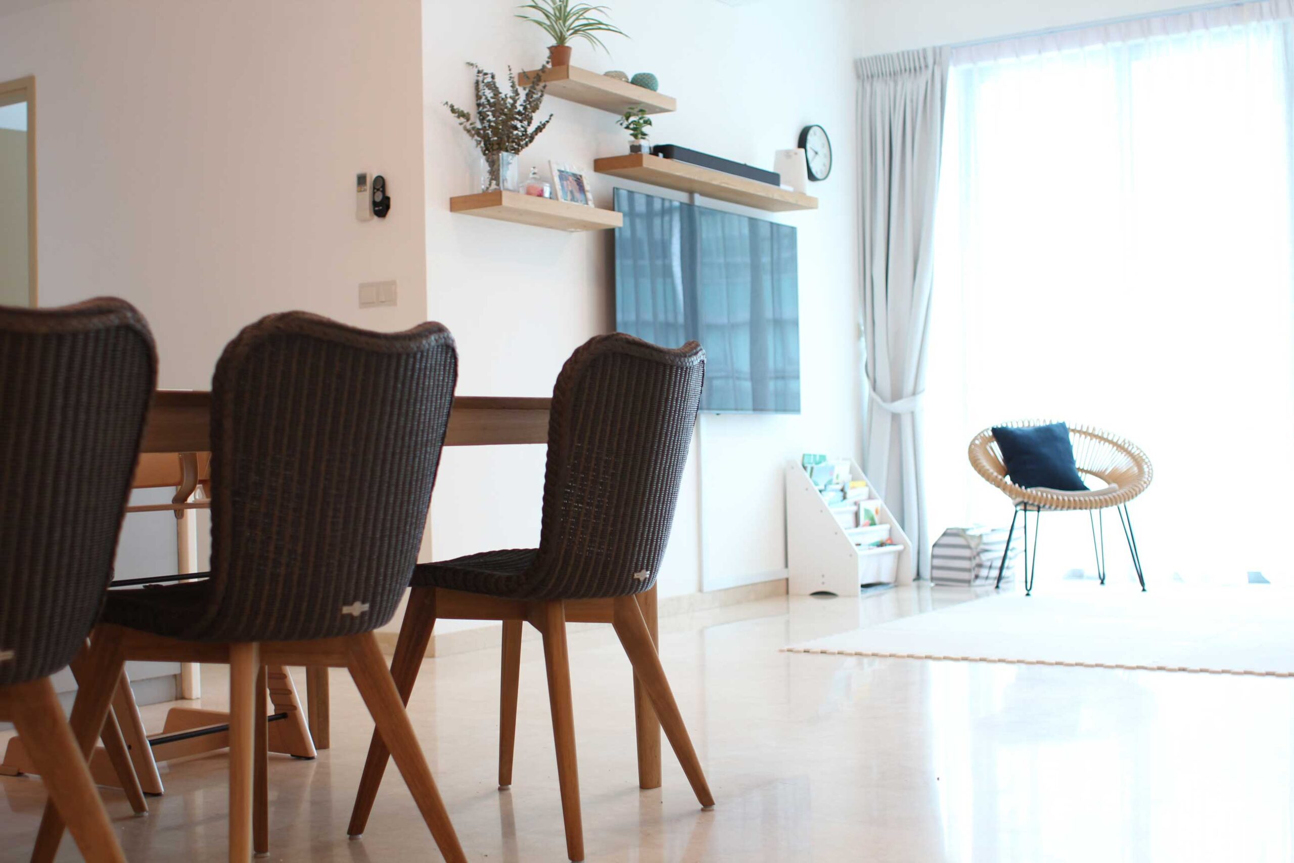 Helping a client transition from a furnished to an unfurnished residence, we created an interior that truly feels like theirs. Warm wooden tones in the dining area blend beautifully with unique Singaporean bone-inlay furniture, combining familiarity with local charm. Custom wall shelves in the husband’s study and around the TV add thoughtful functionality without sacrificing style.
