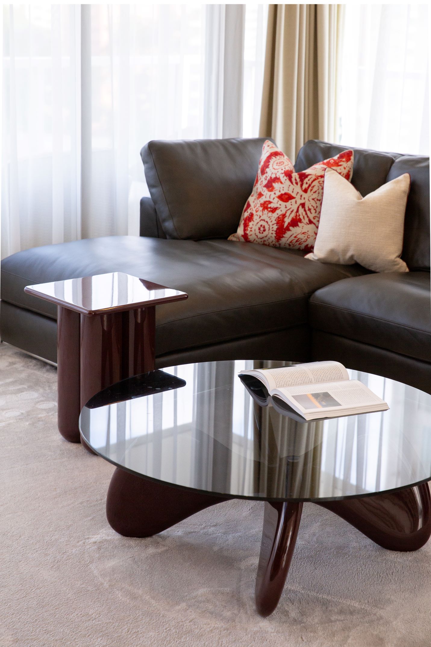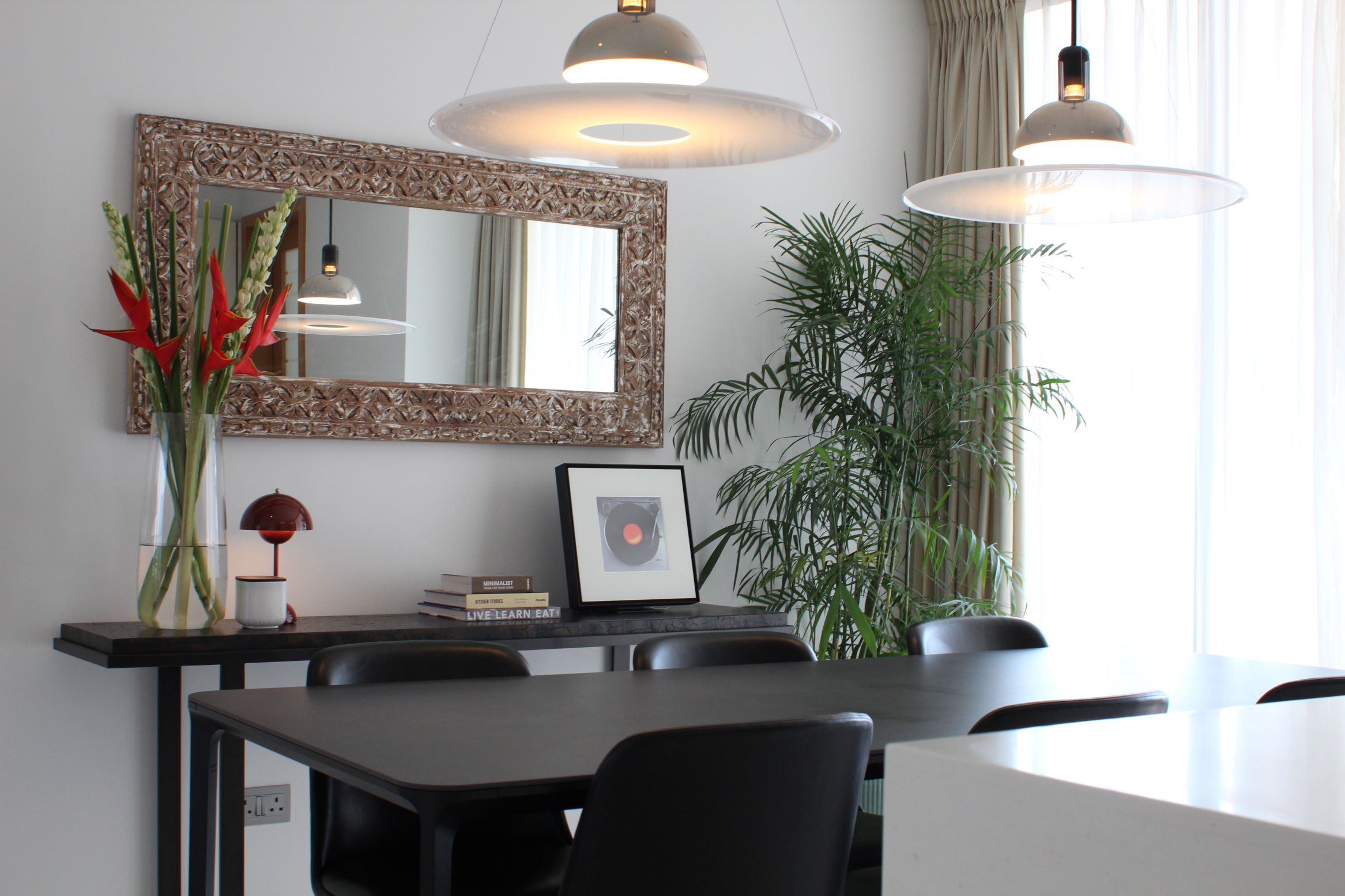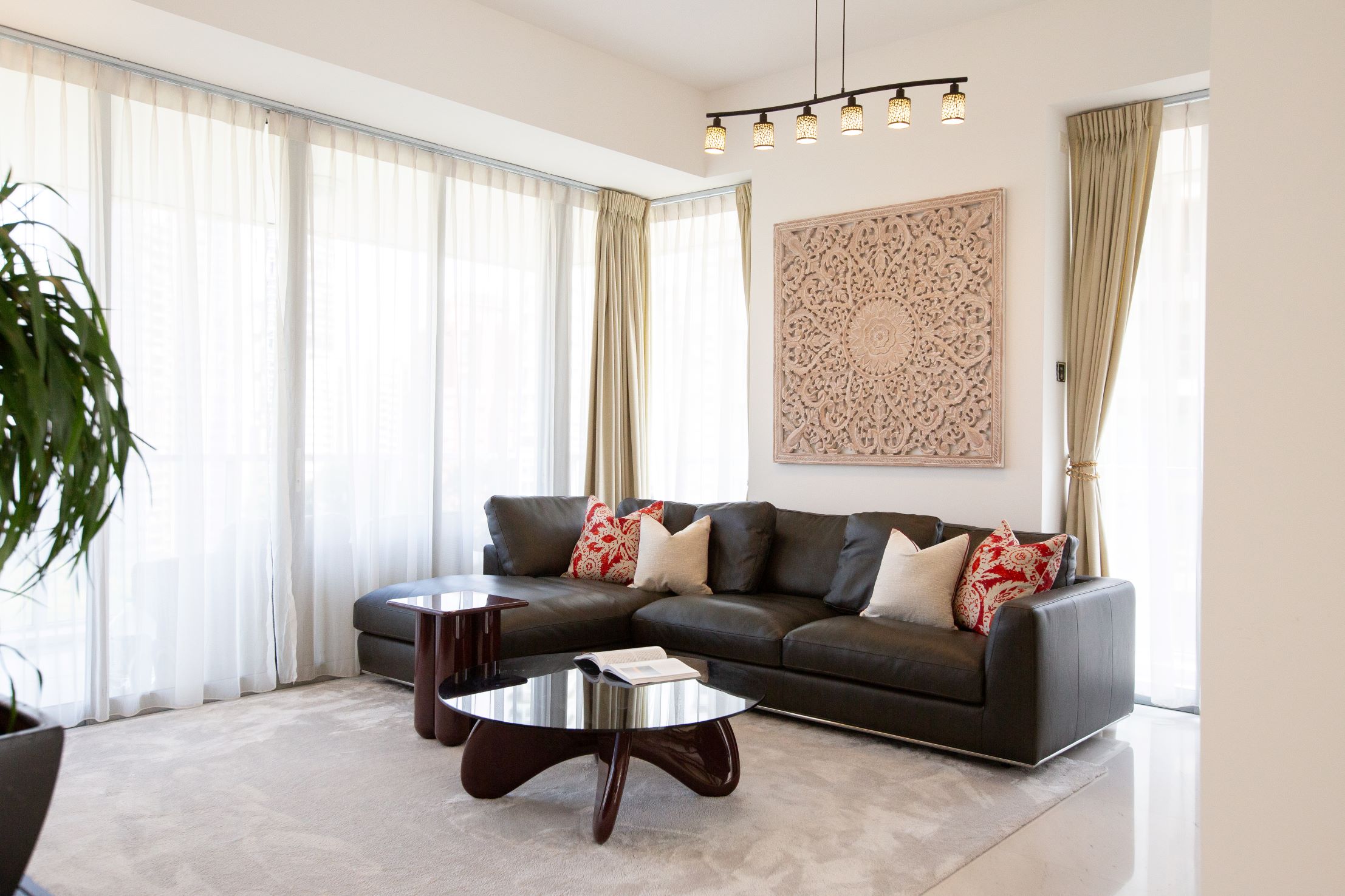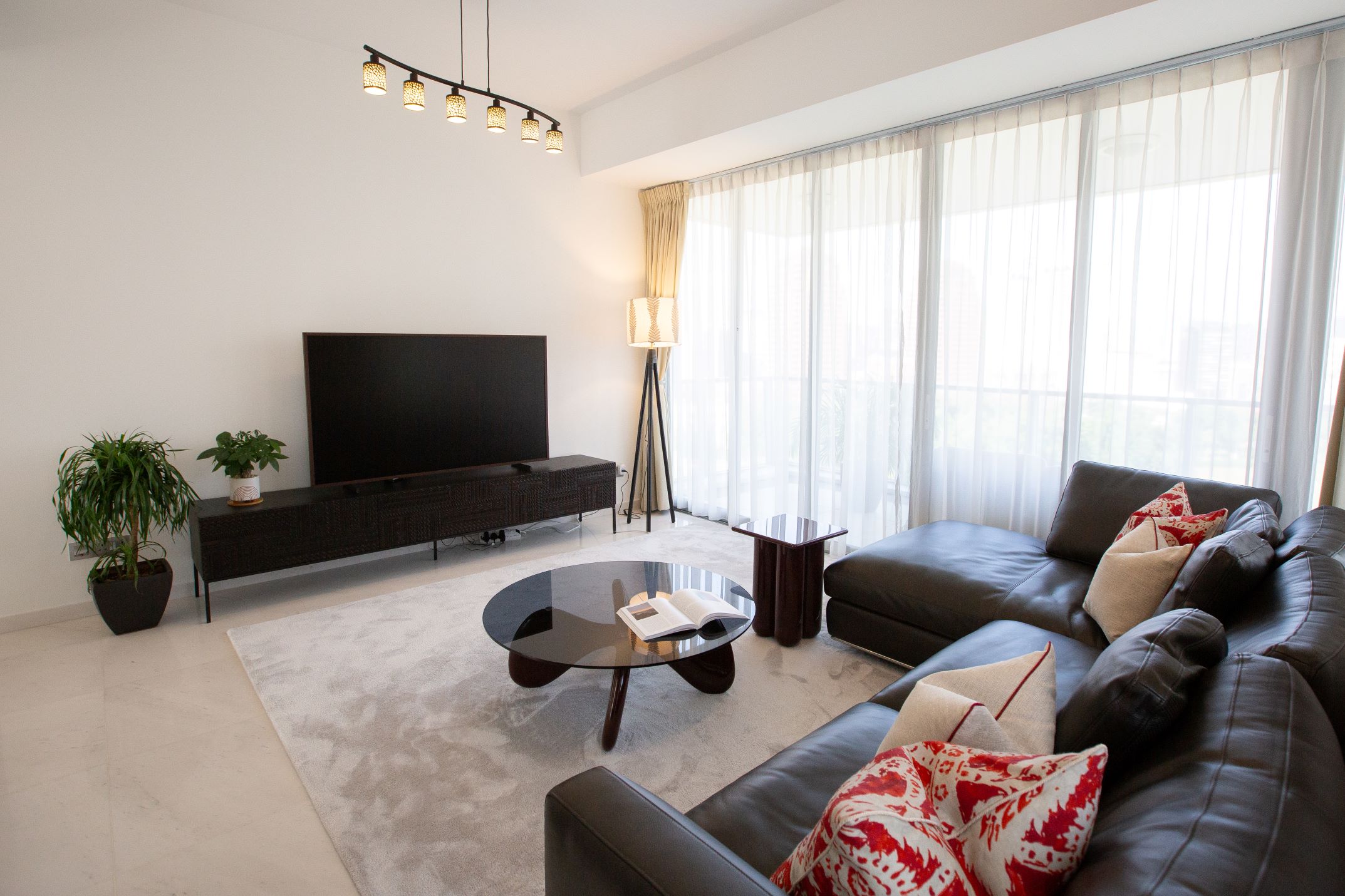 Handcrafted mirrors, bespoke artwork, and a statement TV cabinet draw on Indonesian woodworking traditions, adding texture and authenticity. Warm red accents—in coffee tables, side tables, and cushions—infuse playful energy that matches the client’s vibrant personality.