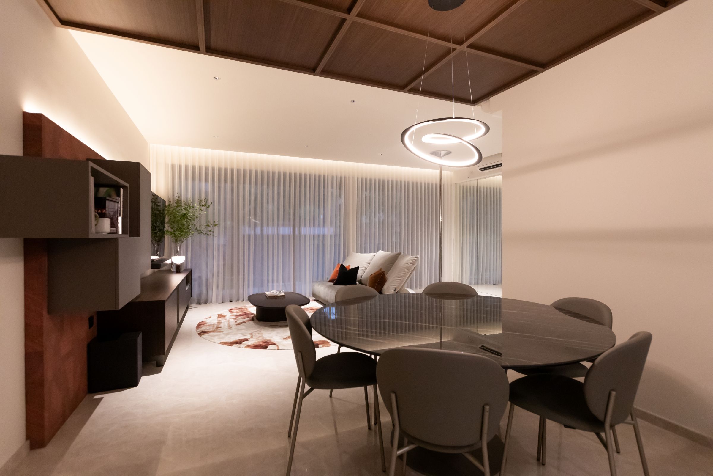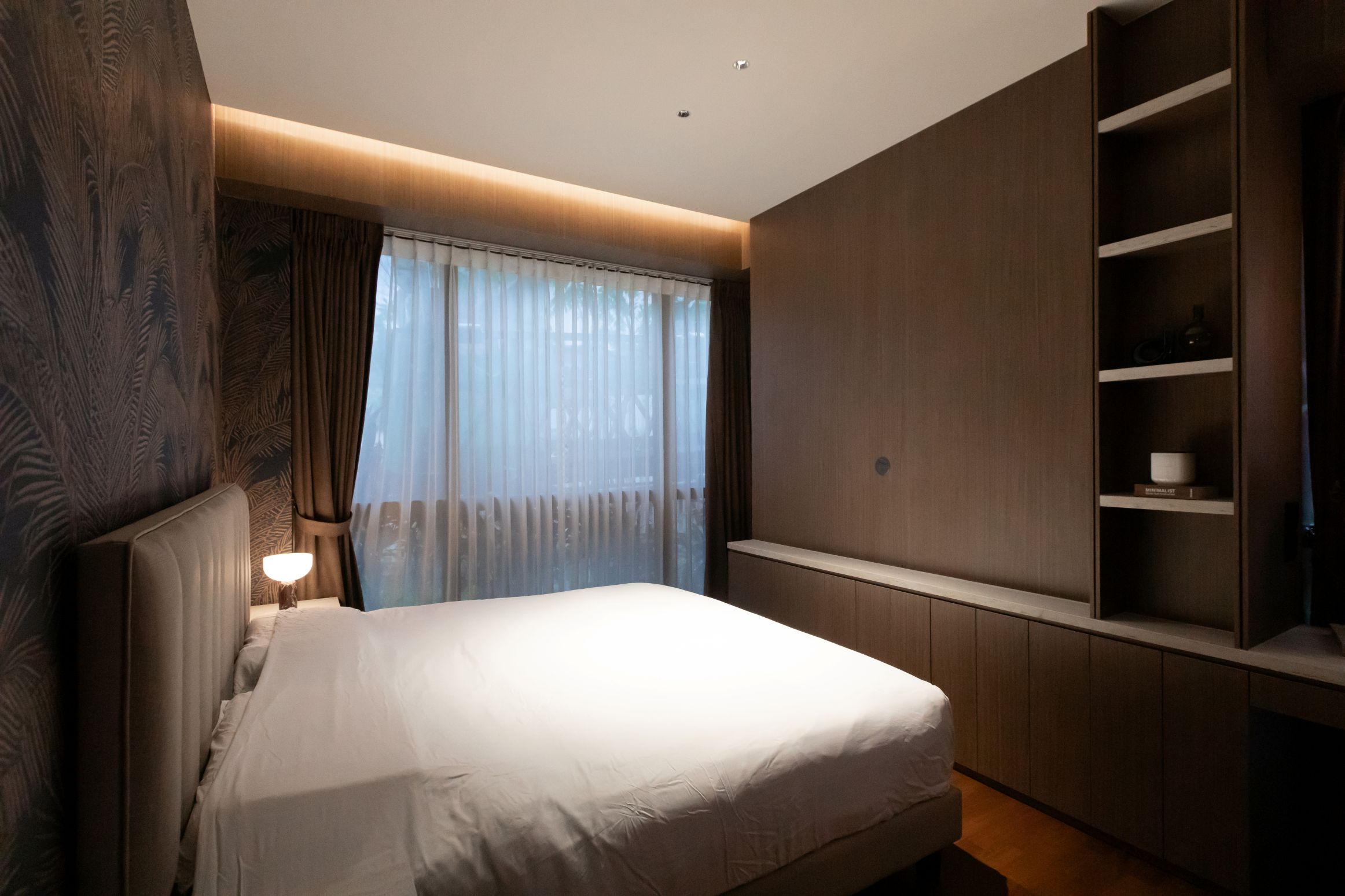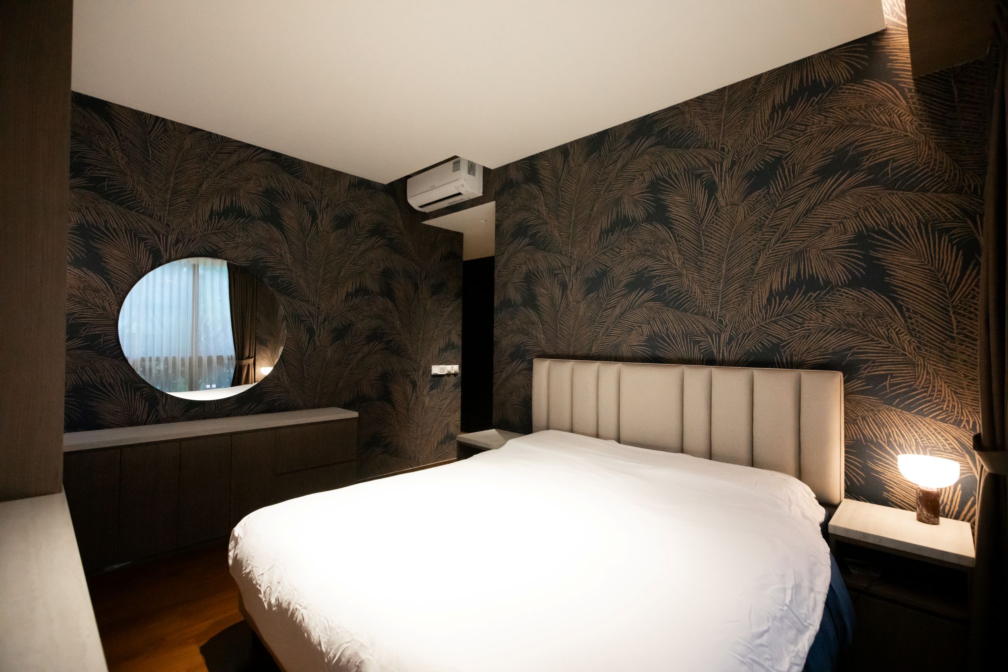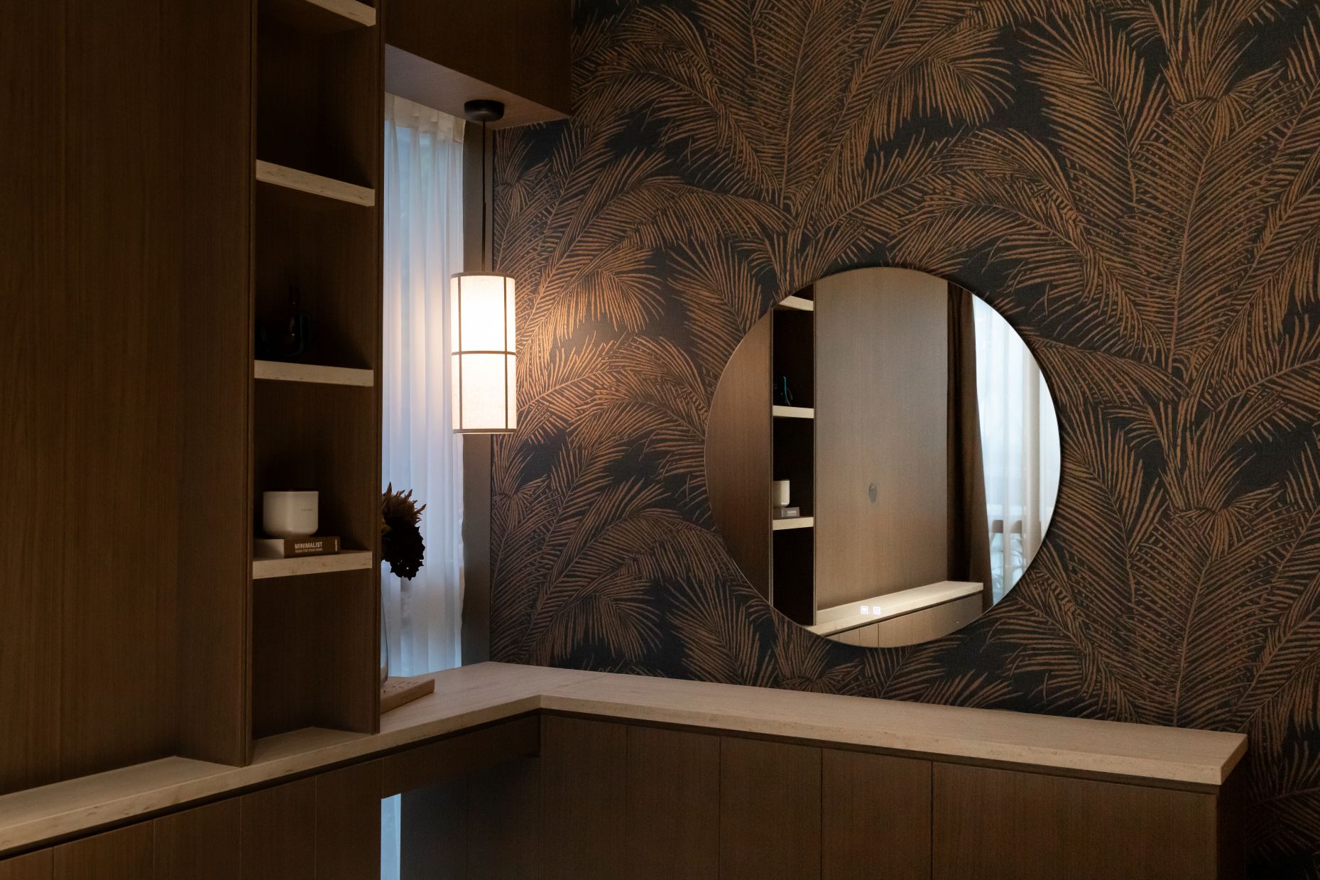 When a Singaporean couple moved into their newly built four-bedroom condominium, they saw potential for something more — a space tailored to their life together. They asked us to help bring that vision to life with renovation and interior styling. To create an expansive living–dining area, we removed one room entirely, but our true focus was in the finer details: a space for the wife’s pole dancing hobby, a serene bedroom for rest, and clever storage by the entrance for their dog’s accessories. We subtly lowered the dining room ceiling to add depth and intimacy, and designed the TV area by blending elegant Molteni&C furniture with bespoke joinery for a harmonious look. The chosen sofa, with its rotating design, allows effortless reconfiguration — ideal for both lounging and making space for dance practice. In the bedroom, palm-leaf wallpaper inspired by Singapore was selected, but the colors were softened to create a calm, sophisticated atmosphere. Lighting design played a vital role throughout, enhancing textures and creating warmth. The transformation is striking — every choice in color, material, and illumination now works together to bring a refreshing sense of openness and peace to everyday life.