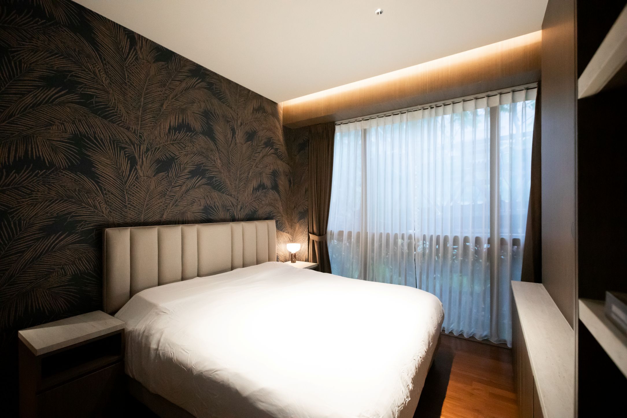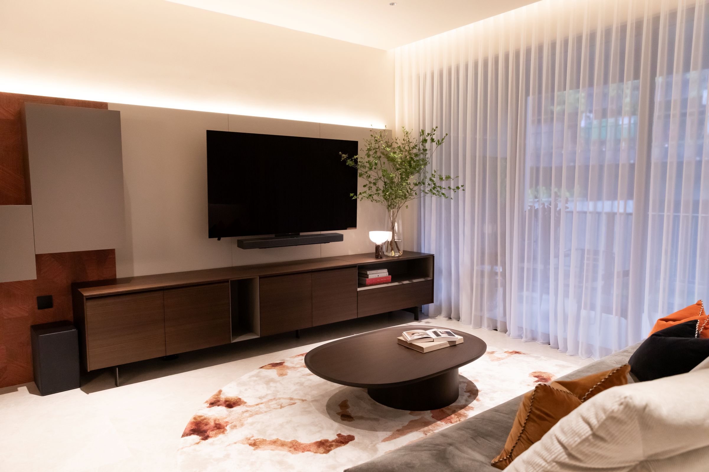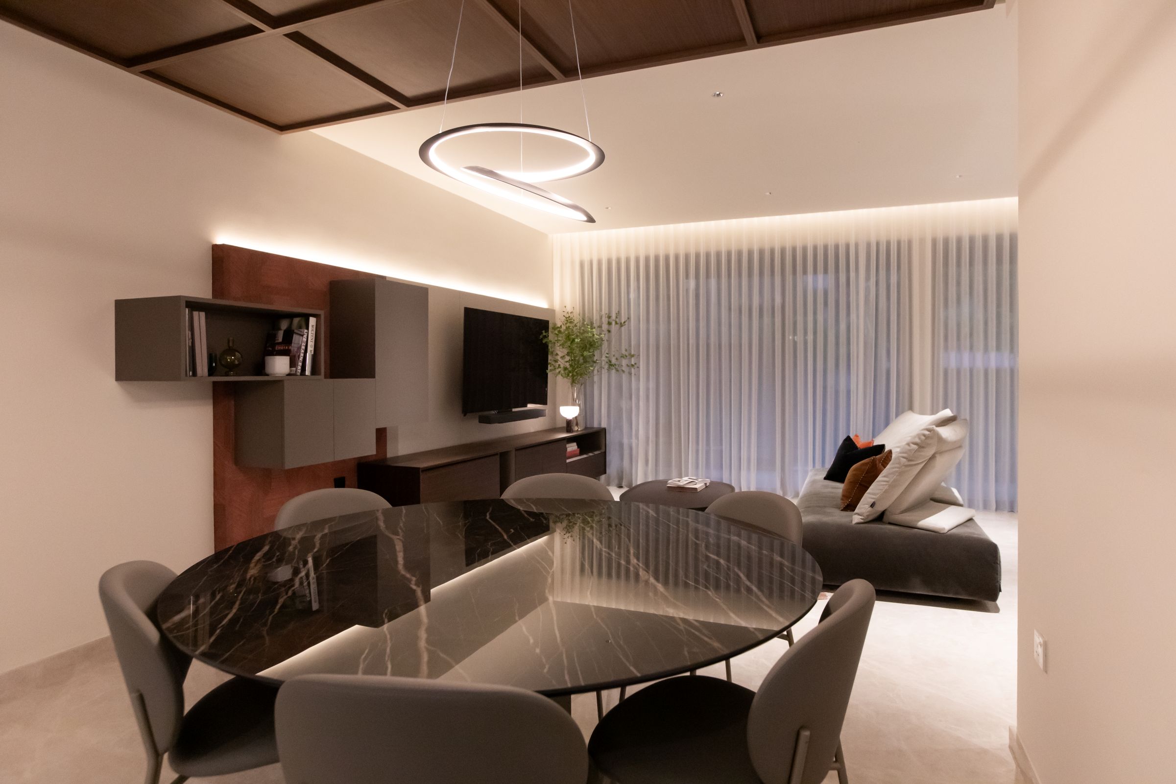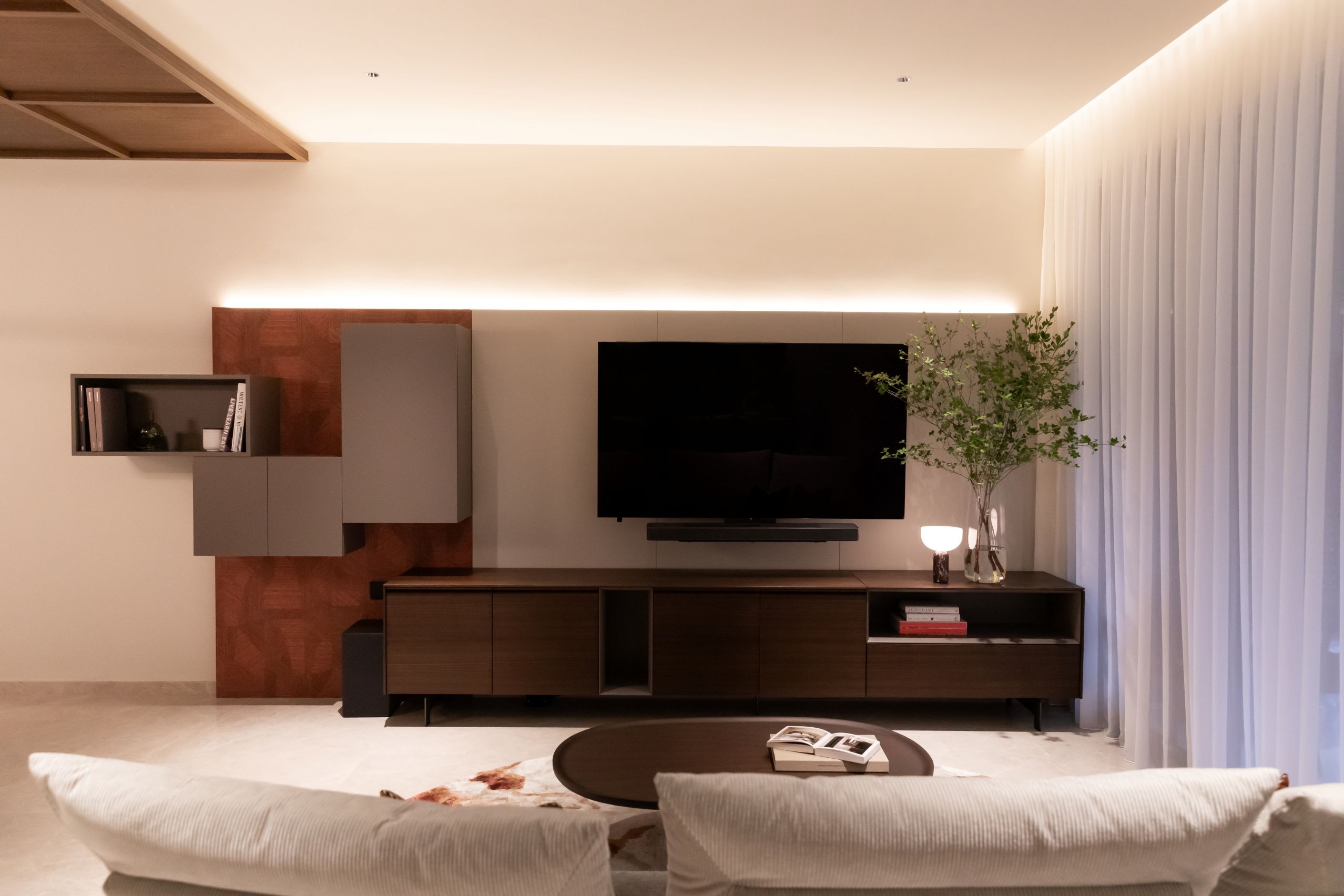 When a Singaporean couple moved into their newly built four-bedroom condominium, they saw potential for something more — a space tailored to their life together. They asked us to help bring that vision to life with renovation and interior styling. To create an expansive living–dining area, we removed one room entirely, but our true focus was in the finer details: a space for the wife’s pole dancing hobby, a serene bedroom for rest, and clever storage by the entrance for their dog’s accessories. We subtly lowered the dining room ceiling to add depth and intimacy, and designed the TV area by blending elegant Molteni&C furniture with bespoke joinery for a harmonious look. The chosen sofa, with its rotating design, allows effortless reconfiguration — ideal for both lounging and making space for dance practice. In the bedroom, palm-leaf wallpaper inspired by Singapore was selected, but the colors were softened to create a calm, sophisticated atmosphere. Lighting design played a vital role throughout, enhancing textures and creating warmth. The transformation is striking — every choice in color, material, and illumination now works together to bring a refreshing sense of openness and peace to everyday life.