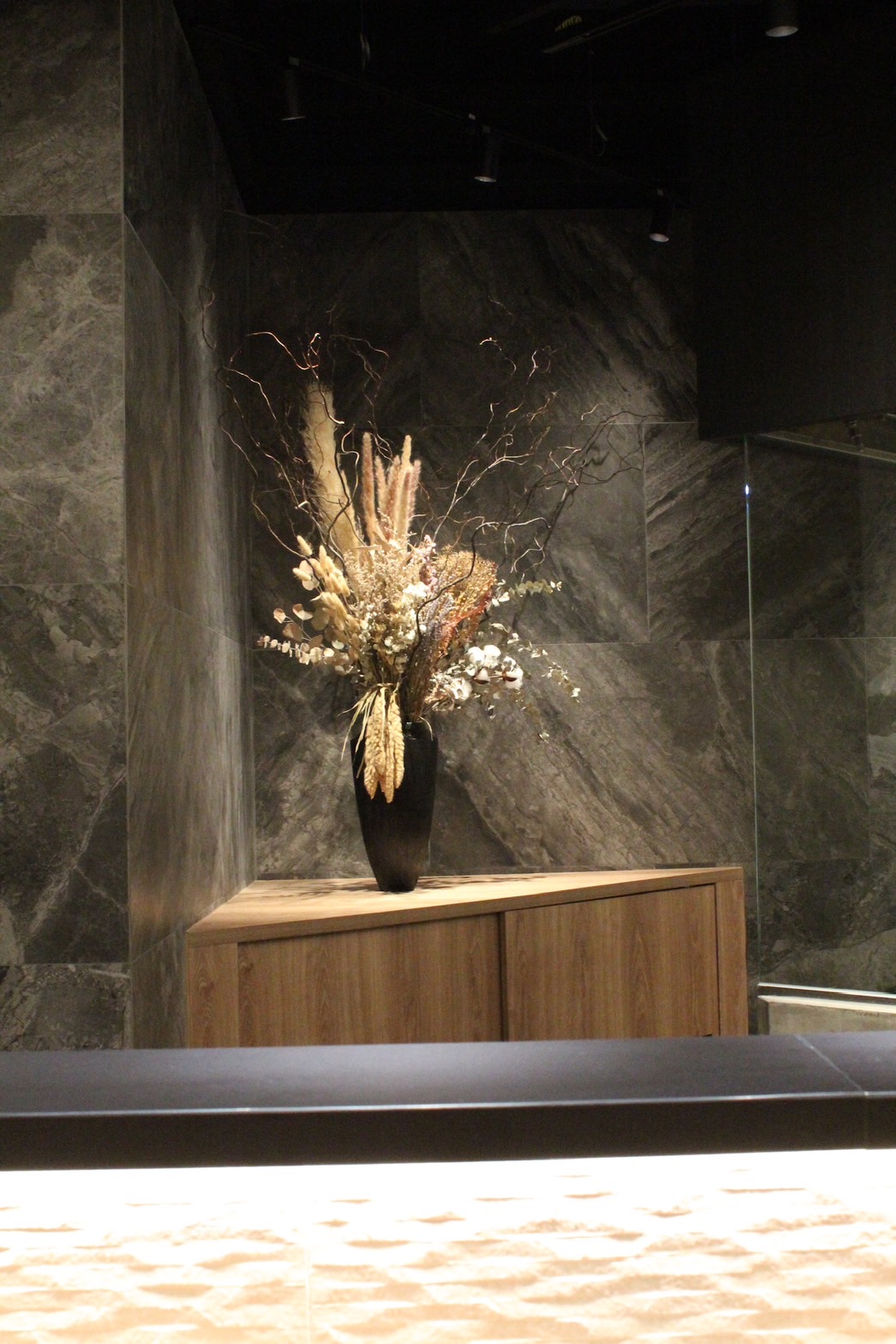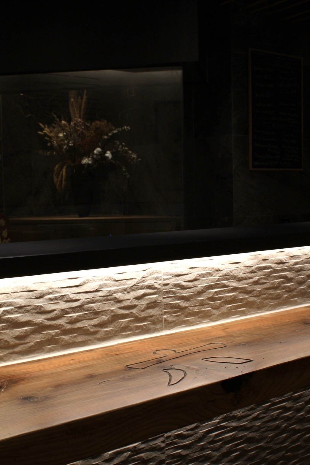 At the heart of the space lies a counter made from reclaimed wood shipped from Nemuro, Hokkaido—once lids for fish tanks on fishing boats. Weathered by saltwater and sea breezes, when first imported, they even smelled of fish! Yet, each plank tells a story. Rather than opting for pristine new timber which is fresh anew and more affordable, we preserved its marks, holes, and history, sealing them in acrylic resin to retain the spirit of the fishermen who once worked upon it.