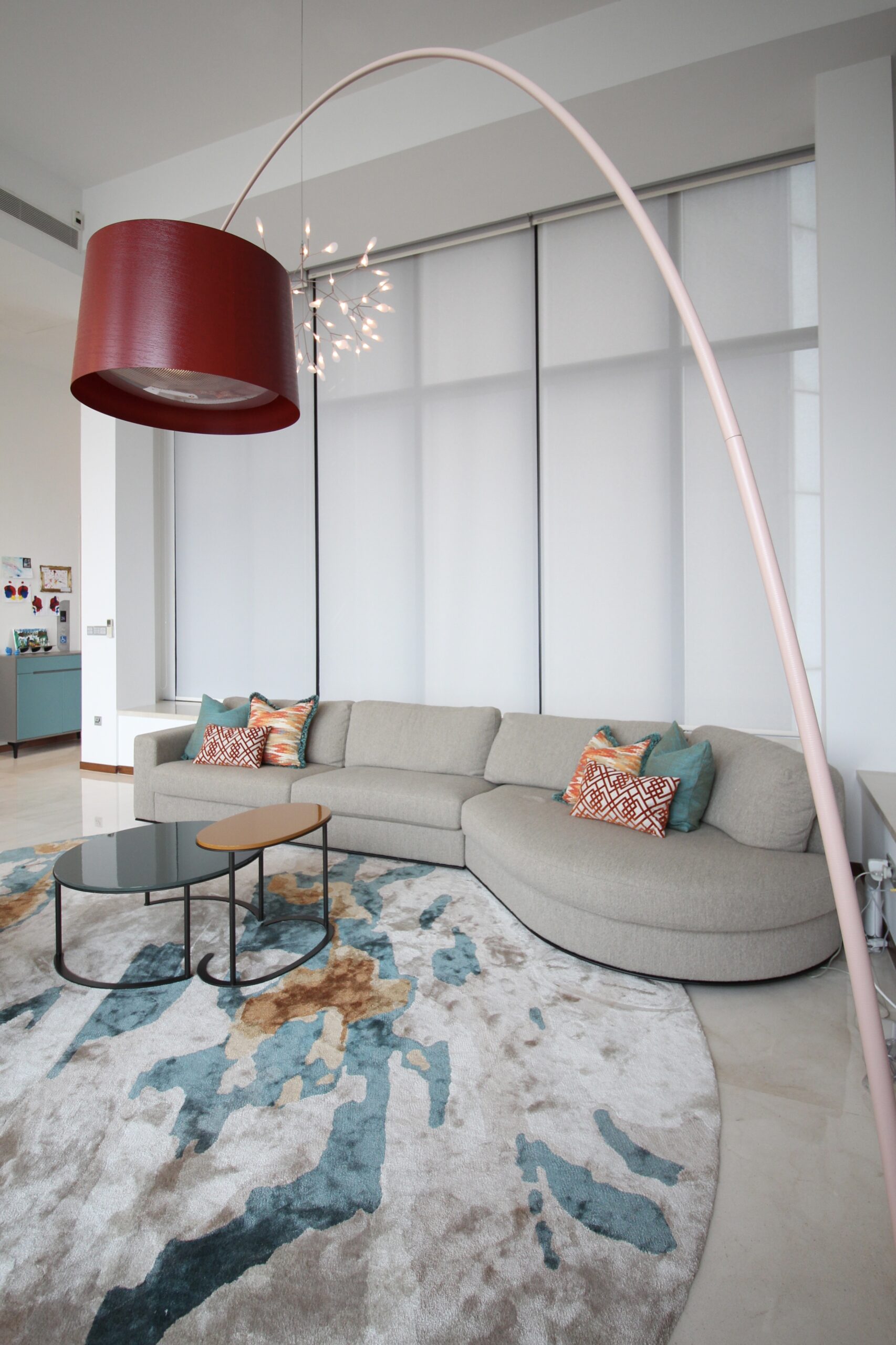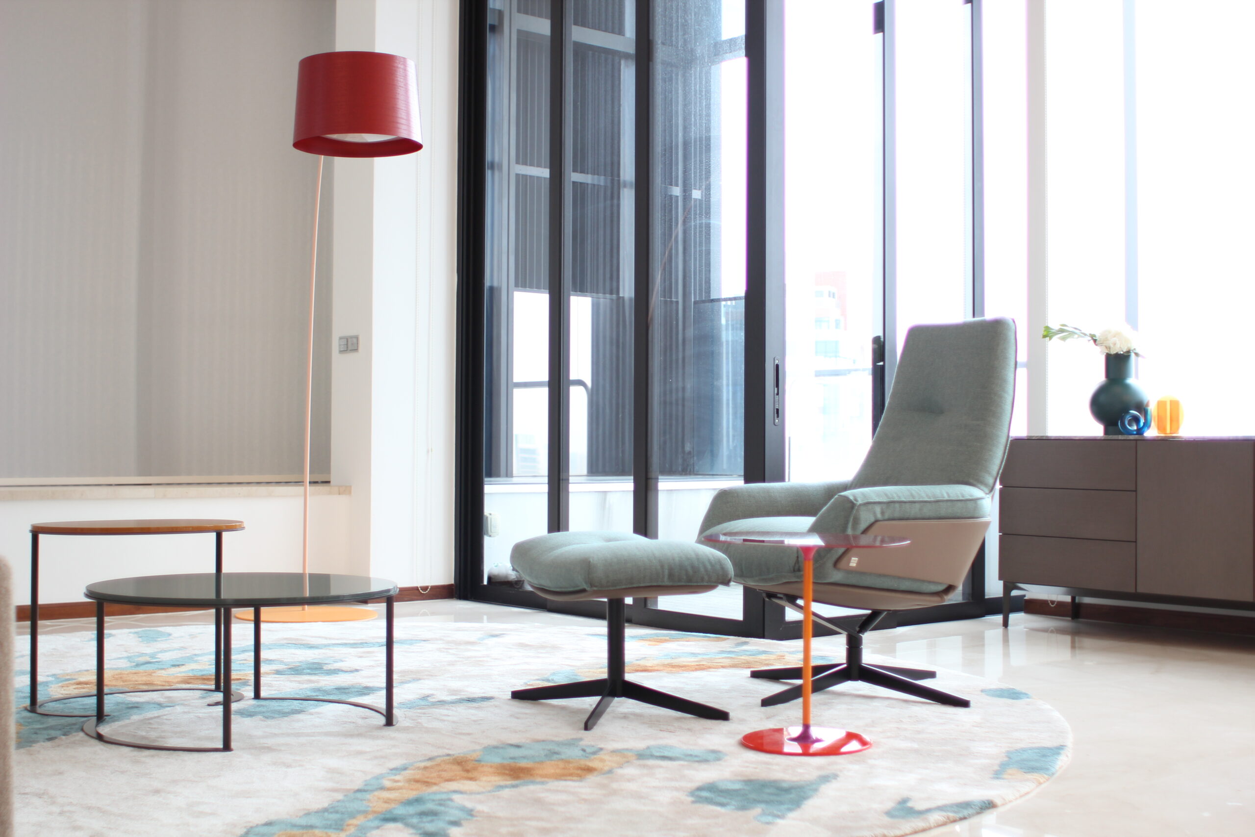 We began with essential, locally available pieces for immediate comfort, while arranging rentals for anything that would take longer to arrive (3-5 months). Once the basics were in place, we curated rugs, art, cushions, and accessories—layering color and texture for a vibrant yet cohesive space.
