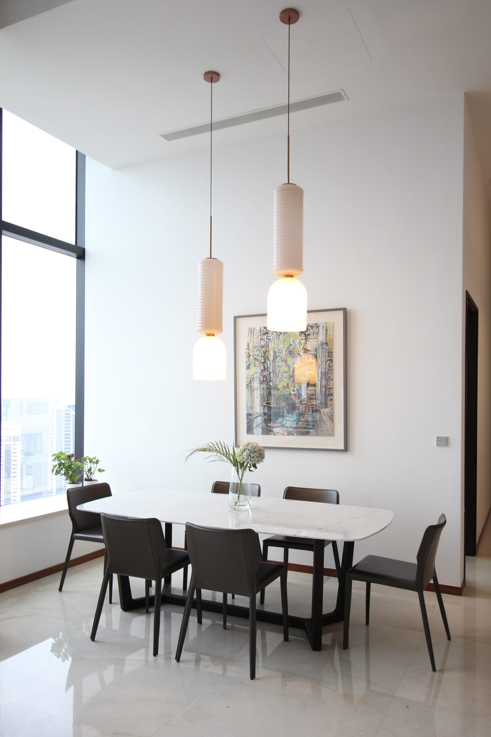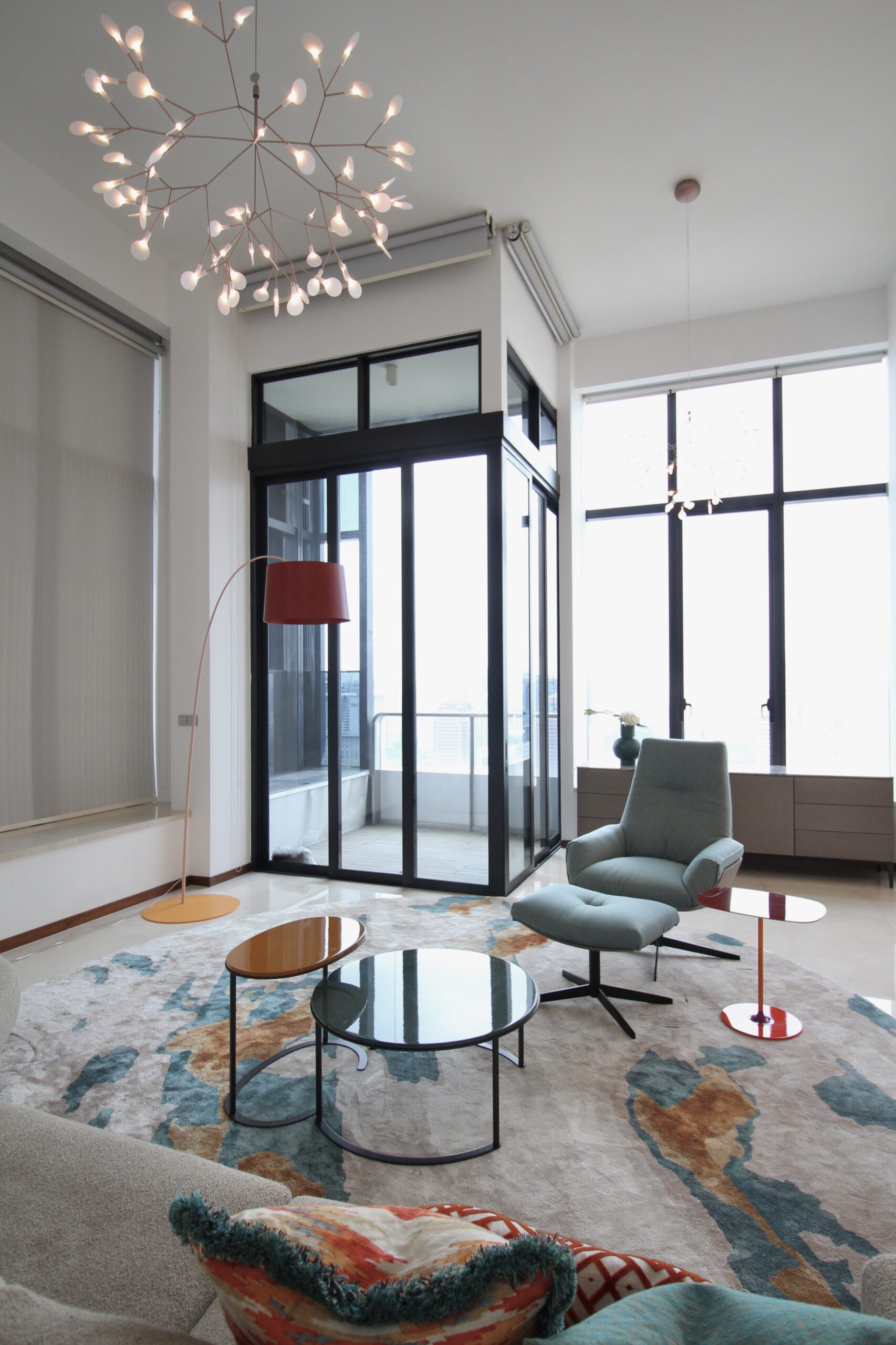 With its soaring ceilings, lighting was a key design element. We sourced stylish yet proportionally balanced fixtures that enhanced the sense of openness. Even the installation logistics—complete with scaffolding—were handled seamlessly.