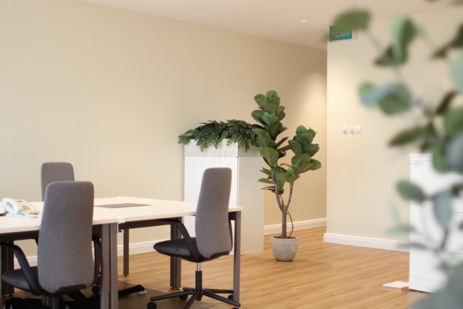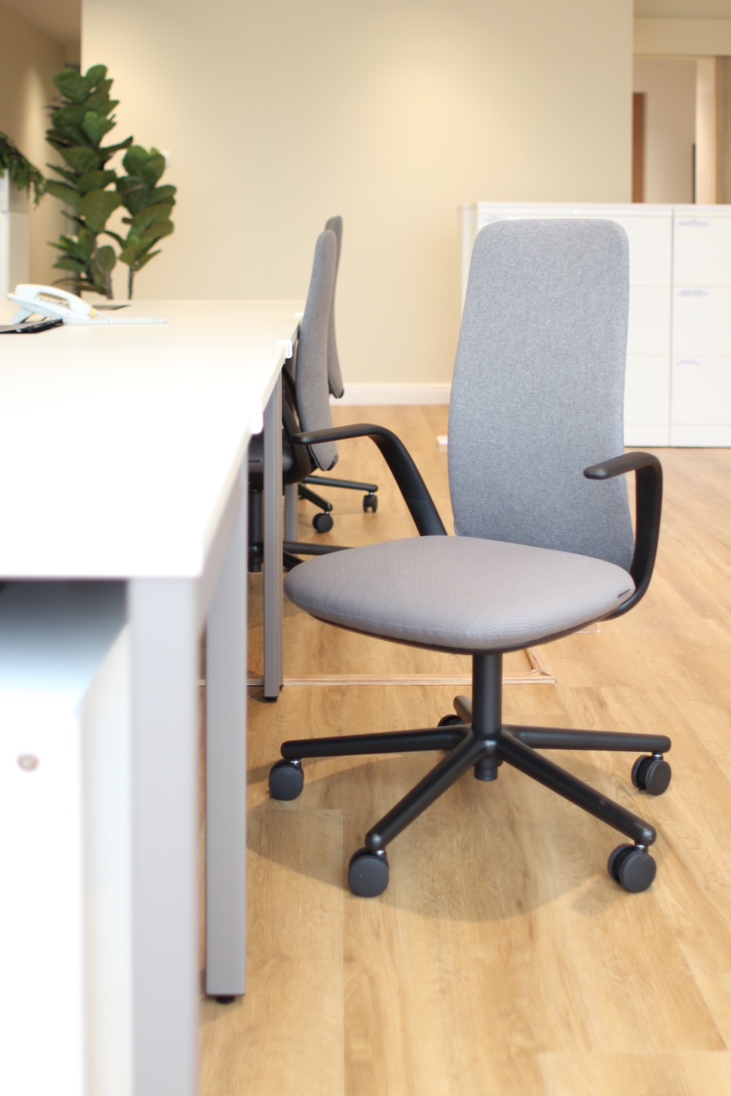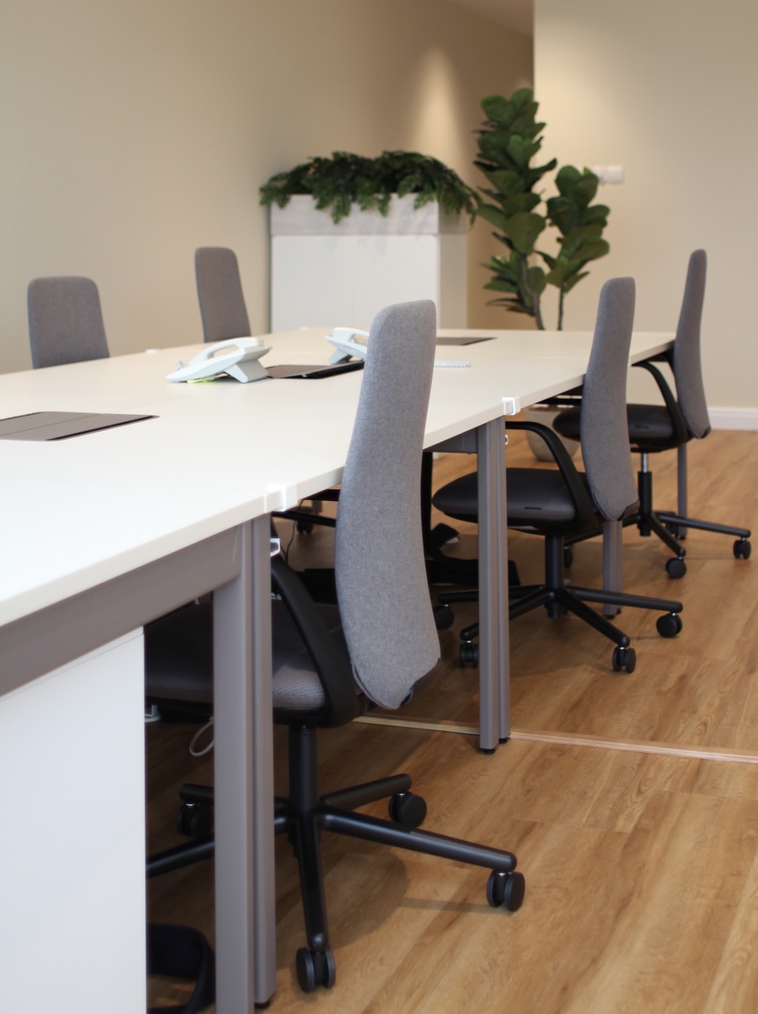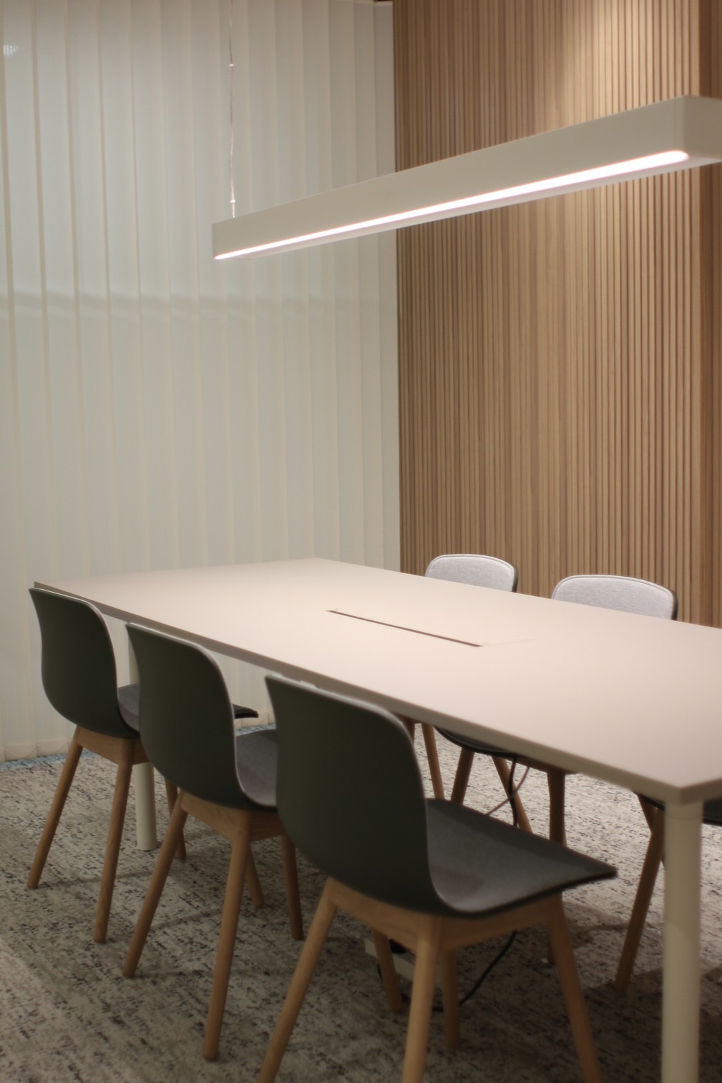 This office renovation proves that simple changes can have a big impact. We refreshed the lighting, flooring, walls, and furniture, choosing warm tones throughout to create a welcoming yet professional space. The new lighting keeps things bright enough for work while using a warmer color temperature for a more relaxed atmosphere. In the meeting room, we drew inspiration from the Finnish airport lounge, envisioned by a company president. Lean lines, warm colors, and an inviting ambience that encourages conversation. In this pared-back setting, the quality of each carefully selected furniture piece truly shines, with the selection made in collaboration with the company's person in charge
